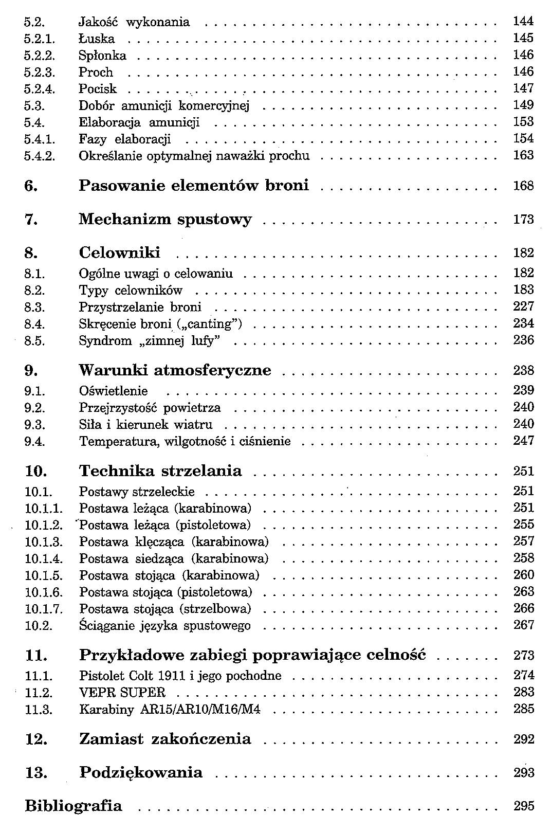 W publikacji zawarto kompendium wiedzy na temat: podstaw balistyki, dynamiki broni strzeleckiej, luf, amunicji, pasowania elementów broni, mechanizmów spustowych, różnych typów celowników i celowania, wpływu warunków atmosferycznych na strzelanie, techniki strzelania, przykładowych modyfikacji broni poprawiających jej celność.