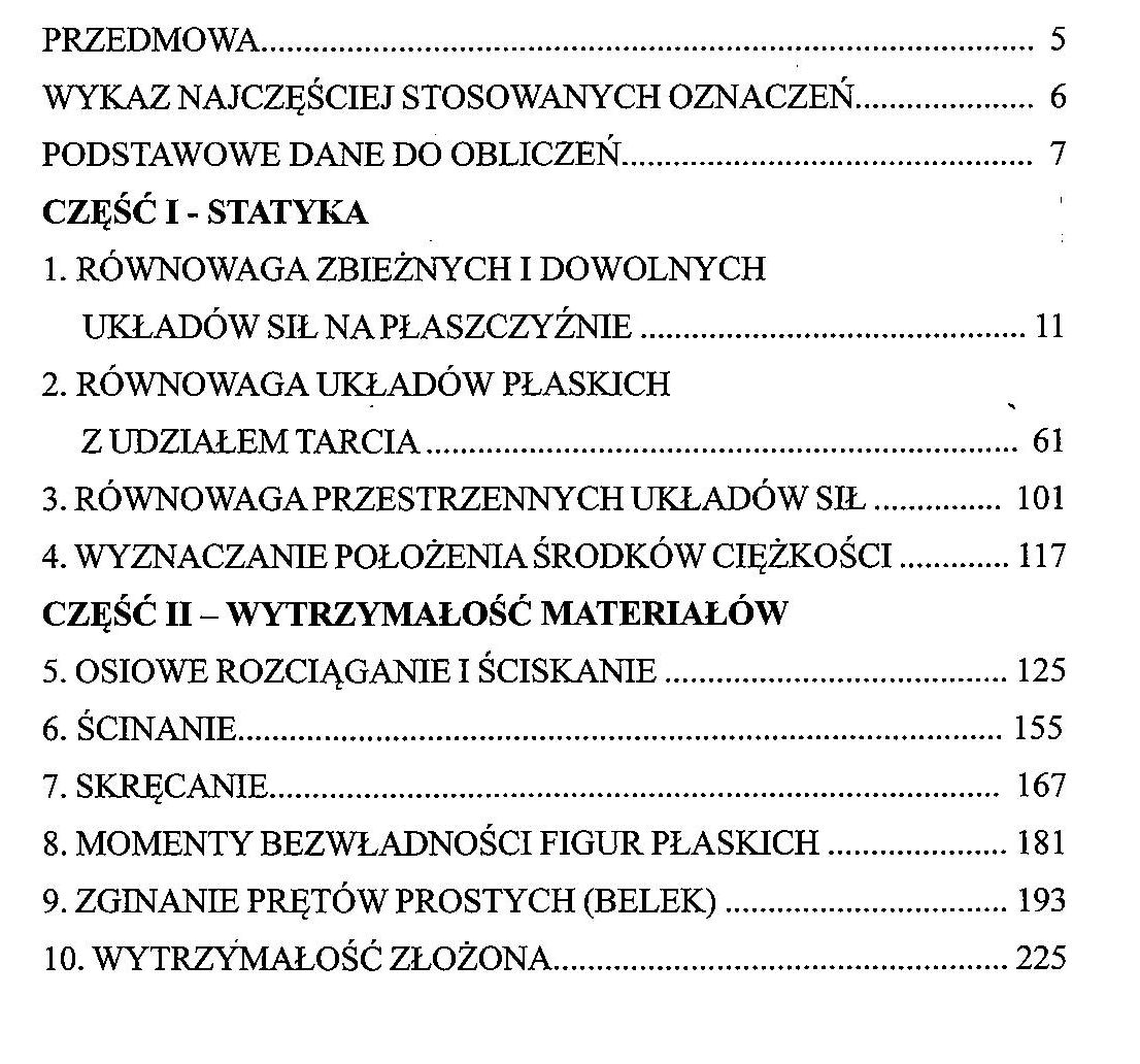 Skrypt przeznaczony jest dla studentów studiów inżynierskich, mających w programie ćwiczenia rachunkowe z mechaniki oraz wytrzymałości materiałów w zakresie podstawowym.. Poszczególne rozdziały dotyczące zagadnień równowagi statycznej i wytrzymałości materiałów zawierają zadania w pełni rozwiązane wraz z odpowiedziami. Zmieszczono również tabele zawierające podstawowe właściwości i parametry wytrzymałościowe dla najczęściej stosowanych materiałów konstrukcyjnych, pomocne w obliczeniach rachunkowych, dotyczących różnych przypadków wytrzymałościowych.