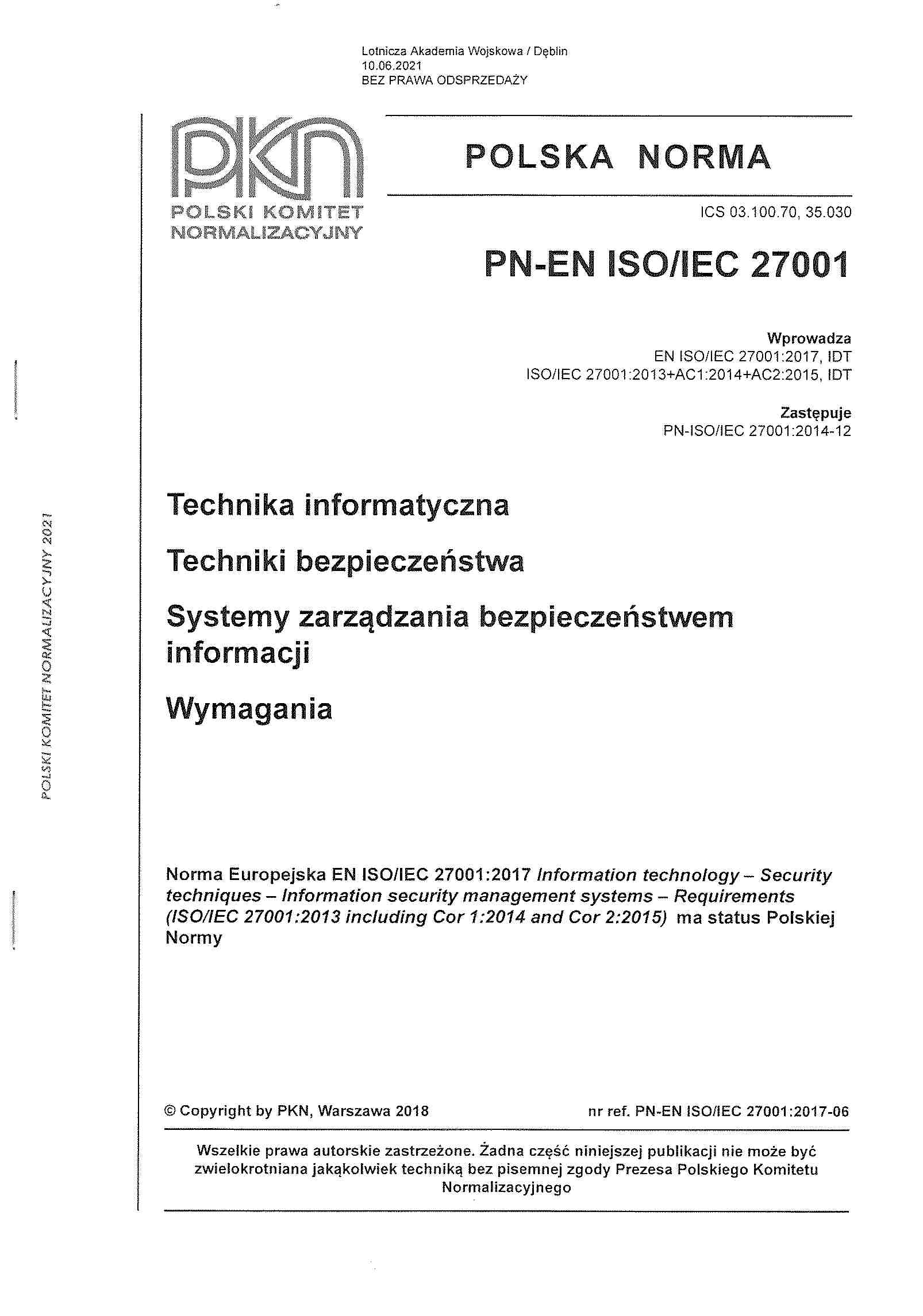Norma Europejska EN ISO/IEC 27001:2017 [...] ma status Polskiej Normy.