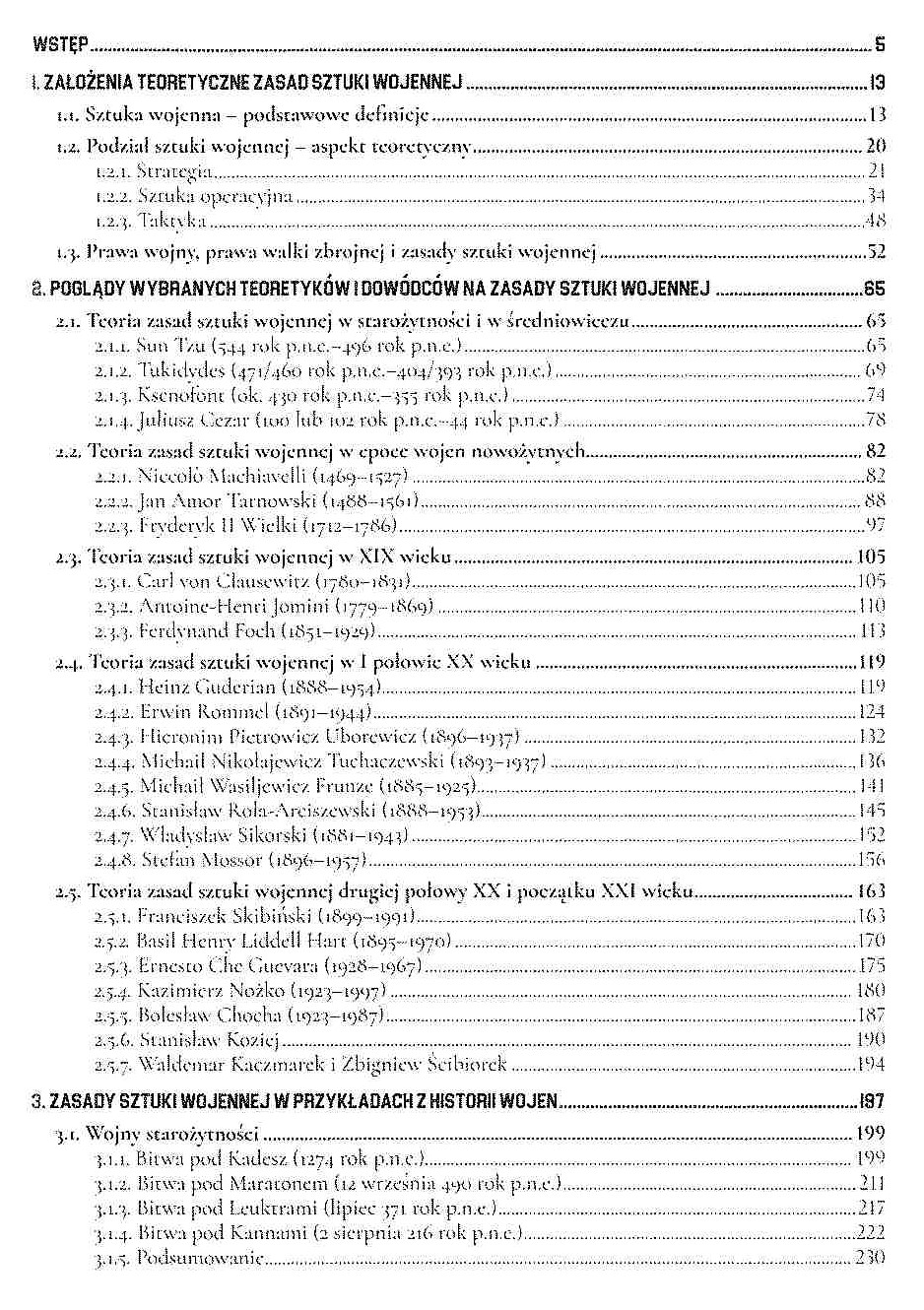 Bogato ilustrowana, elegancko wydana publikacja autorstwa płk. dr. hab. Jacka Lasoty – doświadczonego wojskowego i naukowca, w interesujący i przystępny sposób przedstawia Czytelnikowi najważniejsze aspekty teoretyczne tytułowego zagadnienia. Autor w syntetyczny sposób przedstawił poglądy aż 24 teoretyków na temat zasad sztuki wojennej oraz poddał analizie ich praktyczne zastosowanie w szerokim przekroju bitew i bojów – od starożytności do czasów współczesnych. To pozycja nie tylko dla specjalistów – zainteresuje każdego, kogo ciekawi historia i kto chciałby poznać jej mniej znaną stronę. Autor przedstawia szereg faktów z życia wybitnych dowódców, a także konkretne przyczyny wielkich zwycięstw i porażek na polach najważniejszych bitew w historii ludzkości.