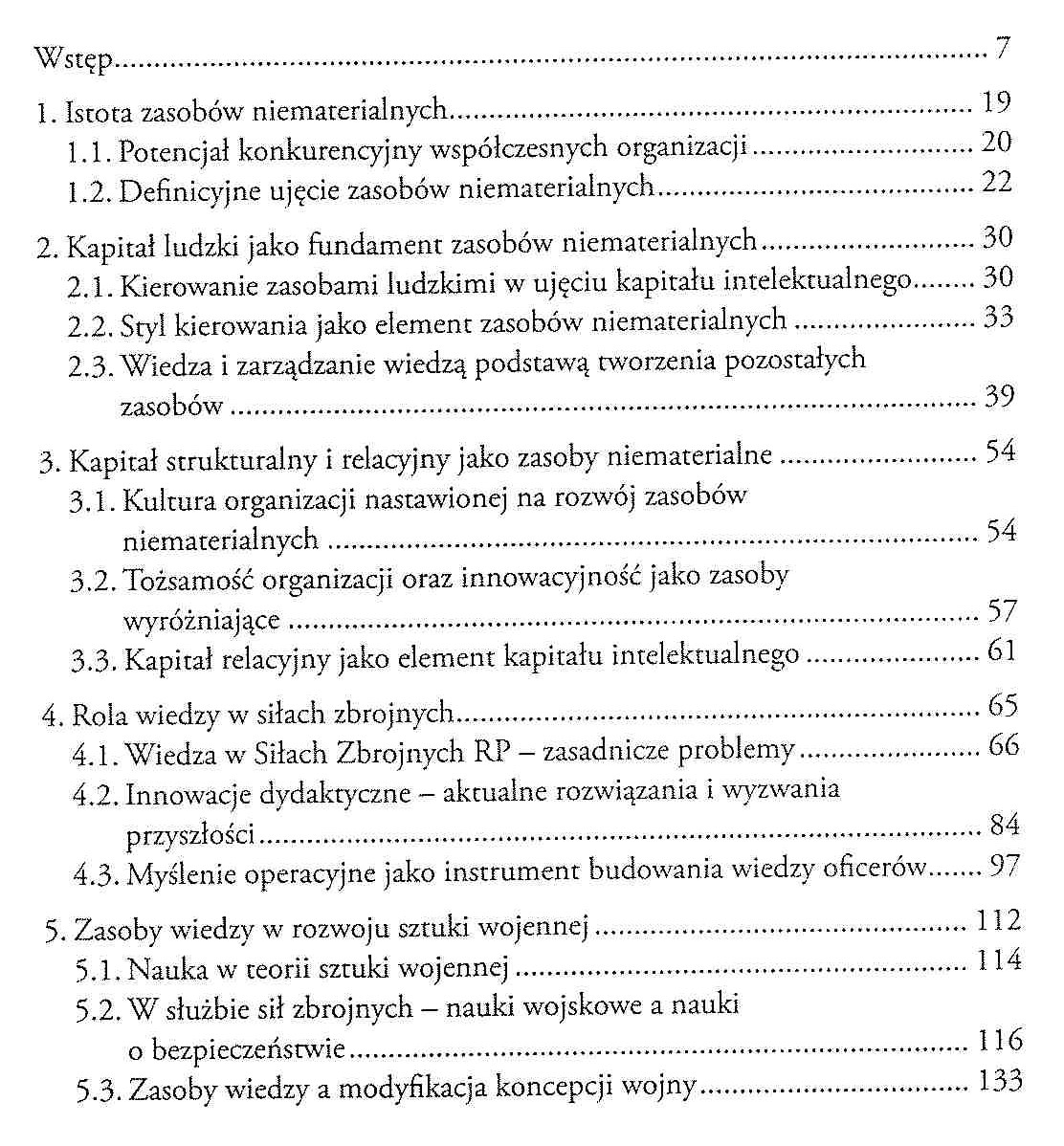 Prezentowana publikacja zawiera specjalistyczne podejście do problematyki zarządzania wiedzą w kontekście wiedzy postrzeganej jako element kapitału niematerialnego sił zbrojnych. Publikacja jest monograficznym opracowaniem obejmującym pięć tematycznie powiązanych rozdziałów, w których przedstawiono zmiany systemowe jakie zachodzą w teorii i praktyce wykorzystania wiedzy w armii. Zasadniczym elementem prowadzonych rozważań jest prezentacja roli zasobów wiedzy w kształtowaniu doświadczenia i umiejętności kadry sił zbrojnych. Zaprezentowane w poszczególnych rozdziałach rozważania Autorki koncentrują się na aktualnym stanie wiedzy teoretycznej oraz wnioskach i doświadczeniach wykorzystywanych przez siły zbrojne. Dużą wartością monografii jest wykorzystanie w treści pracy wielu efektów prac naukowych w postaci konkluzji z przeprowadzonych badań teoretycznych i empirycznych. Rozważania Autorki stanowią indywidualną interpretację faktów będących efektem rozwoju problematyki z zakresu zarządzania wiedzą w siłach zbrojnych.