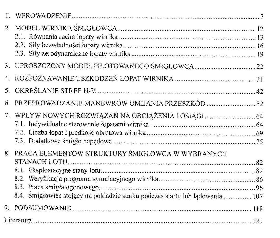 W pracy przedstawiono metody obliczeń symulacyjnych dotyczące zagadnień mechaniki lotu śmigłowca oraz obciążeń i odkształceń wirników nośnych. Skoncentrowano się na kilku problemach o węższym zakresie związanych z bezpieczeństwem użytkowania śmigłowców: rozpoznanie uszkodzeń łopat wirników, określenie obszarów stref H-V, przeprowadzanie manewrów omijania przeszkód, wpływ nowych rozwiązań na obciążenia i osiągi oraz praca elementów struktury śmigłowca w wybranych stanach lotu.