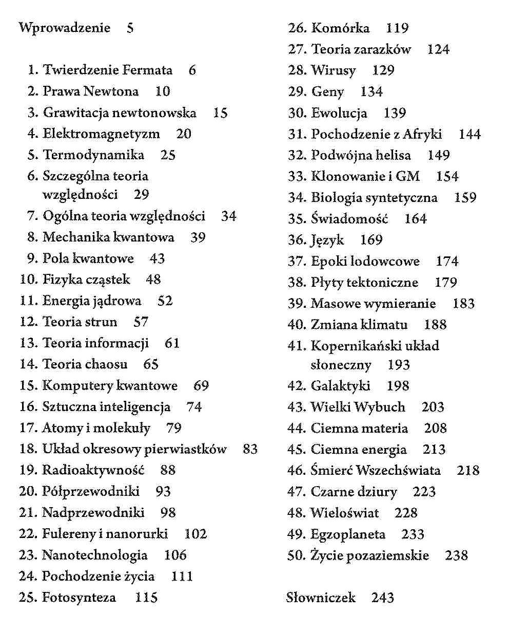 Książa prezentuje 50 najważniejszych idei, które uczeni sformułowali na przestrzeni lat. Nie mogło w niej zabraknąć opisu zasad dynamiki Newtona, szczególnej teorii względności Einsteina, mechaniki kwantowej, czy radioaktywności. Autor prezentuje także kluczowe odkrycia, które zapoczątkowały rozwój nanotechnologii, czy biologii syntetycznej. Podstawowe informacje na temat danej teorii uzupełniono krótkimi biografiami samych uczonych, pokazując ich wykształcenie i życie osobiste.