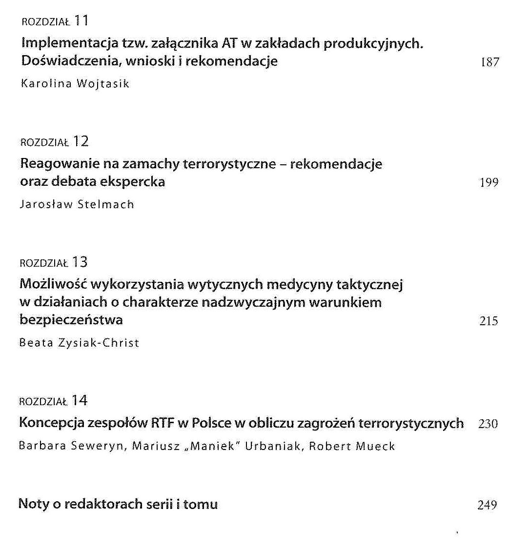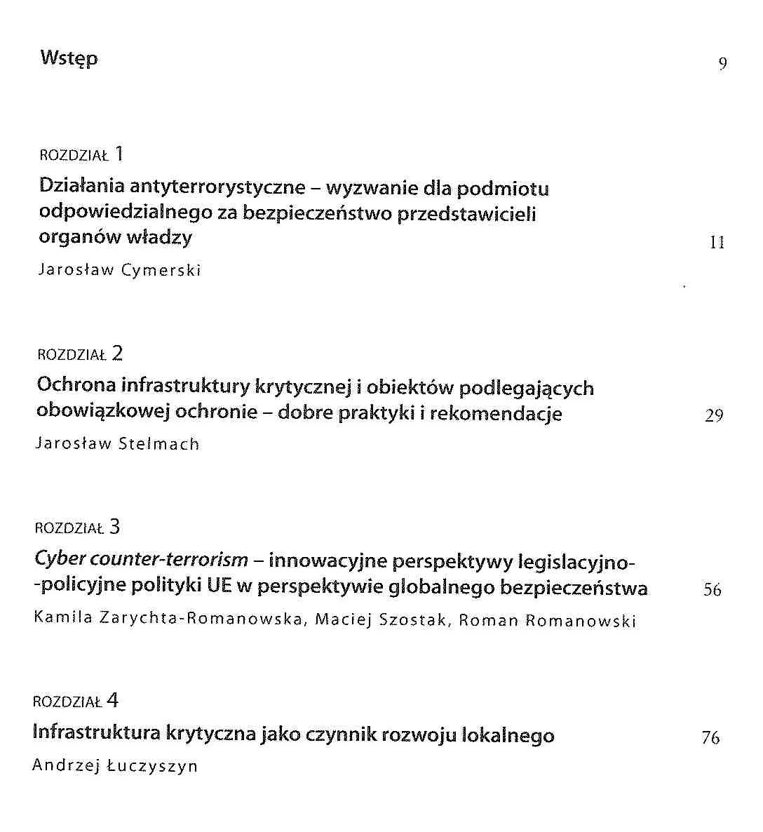 Prezentowany tom poświęcony jest problematyce planowania działań antyterrorystycznych, reagowania i specyfice ochrony infrastruktury krytycznej. Wskazane zagadnienia są jak najbardziej aktualne i wpisują się całkowicie w kierunki aktywności antyterrorystycznych większości państw walczących ze zjawiskiem. Obecnie również w Polsce podejmowane są prace legislacyjne prowadzące do wzmocnienia bezpieczeństwa infrastruktury krytycznej poprzez ustanowienie bardziej obligatoryjnych standardów jej ochrony. Na kolejnych stronach publikacji będzie się można zapoznać z kierunkami tychże zmian i propozycji ustawowych oraz przeczytać o podobnych inicjatywach antyterrorystycznych w innych obszarach funkcjonowania państwa. Tom złożony jest łącznie z czternastu rozdziałów. Do jego powstania przyczyniło się grono wysokiej klasy specjalistów, ekspertów, praktyków, podejmując w zaproponowanych tematach i treści artykułów interesujące wątki porządkujące, otwierające na nowe perspektywy analizy określonych problemów, a także propozycje rozwiązań i rekomendacje.