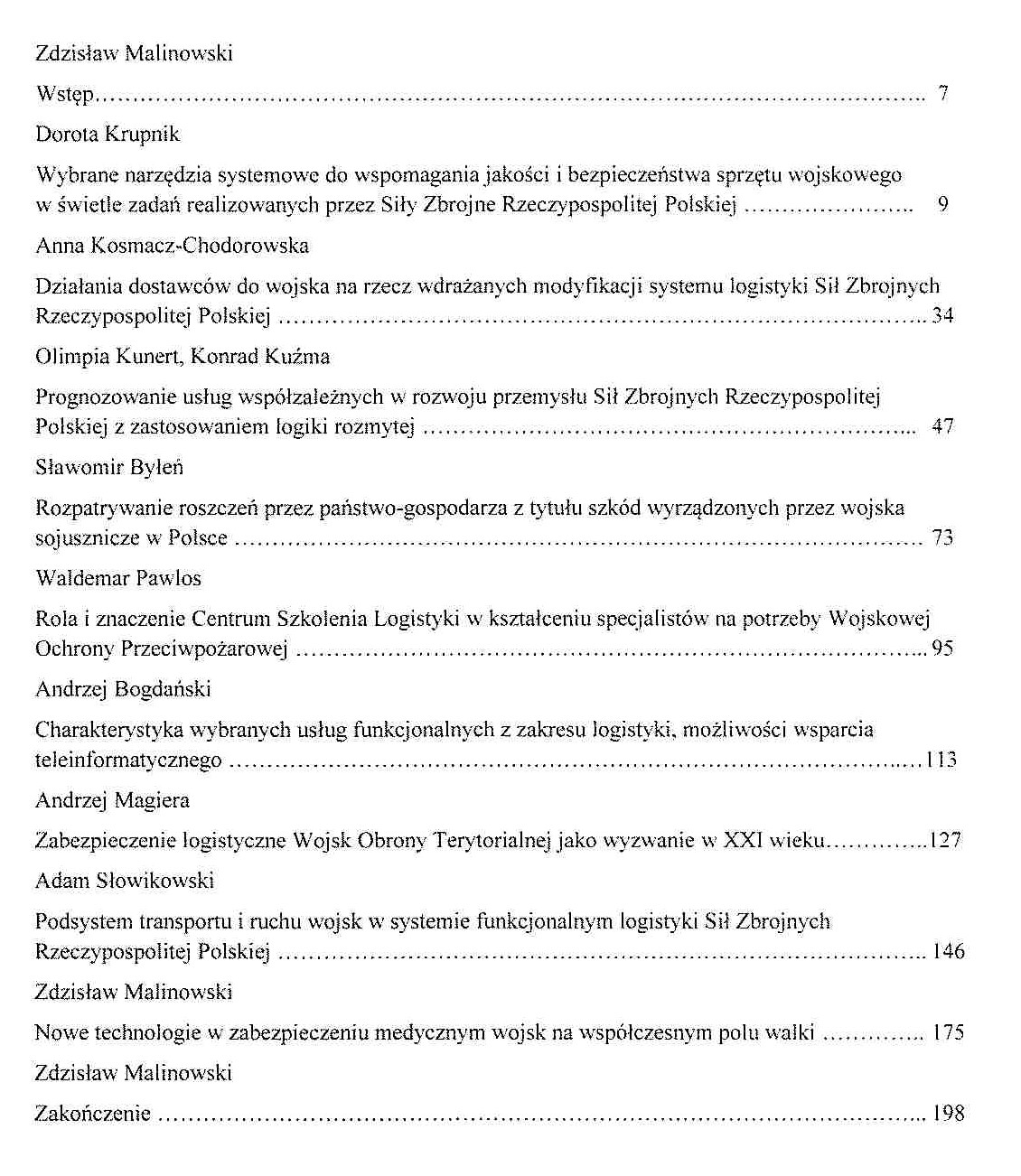 Monografia stanowi zbiór artykułów odnoszących się do wyzwań systemu funkcjonalnego logistyki Sił Zbrojnych RP. Autorzy przedstawiają swoje wyniki badań i wnioski z nich płynące zarówno w obszarze stosowania rozwiązań logistyki wojskowej jak i gospodarczej stanowiącej wsparcie dla systemu funkcjonalnego logistyki Sił Zbrojnych RP. Odnoszą się zarówno do aspektów związanych z użyciem narzędzi systemowych do wspomagania jakości i bezpieczeństwa SpW, dostawców wojskowych, usług współzależnych w kontekście rozwoju przemysłu zbrojeniowego, obszaru państwa-gospodarza, szkolenia specjalistów w Centrum Szkolenia Logistyki, możliwości wsparcia teleinformatycznego logistyki, zabezpieczenia logistycznego Wojsk Obrony Terytorialnej znaczenia, podsystemu transportu i ruchu wojsk w systemie funkcjonalnym logistyki Sił Zbrojnych RP, czy też możliwości zastosowania nowych technologii w zabezpieczeniu medycznym wojsk.