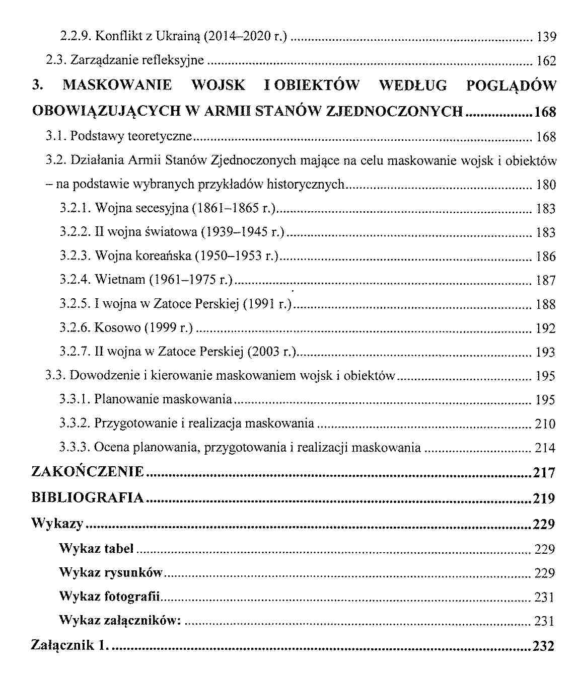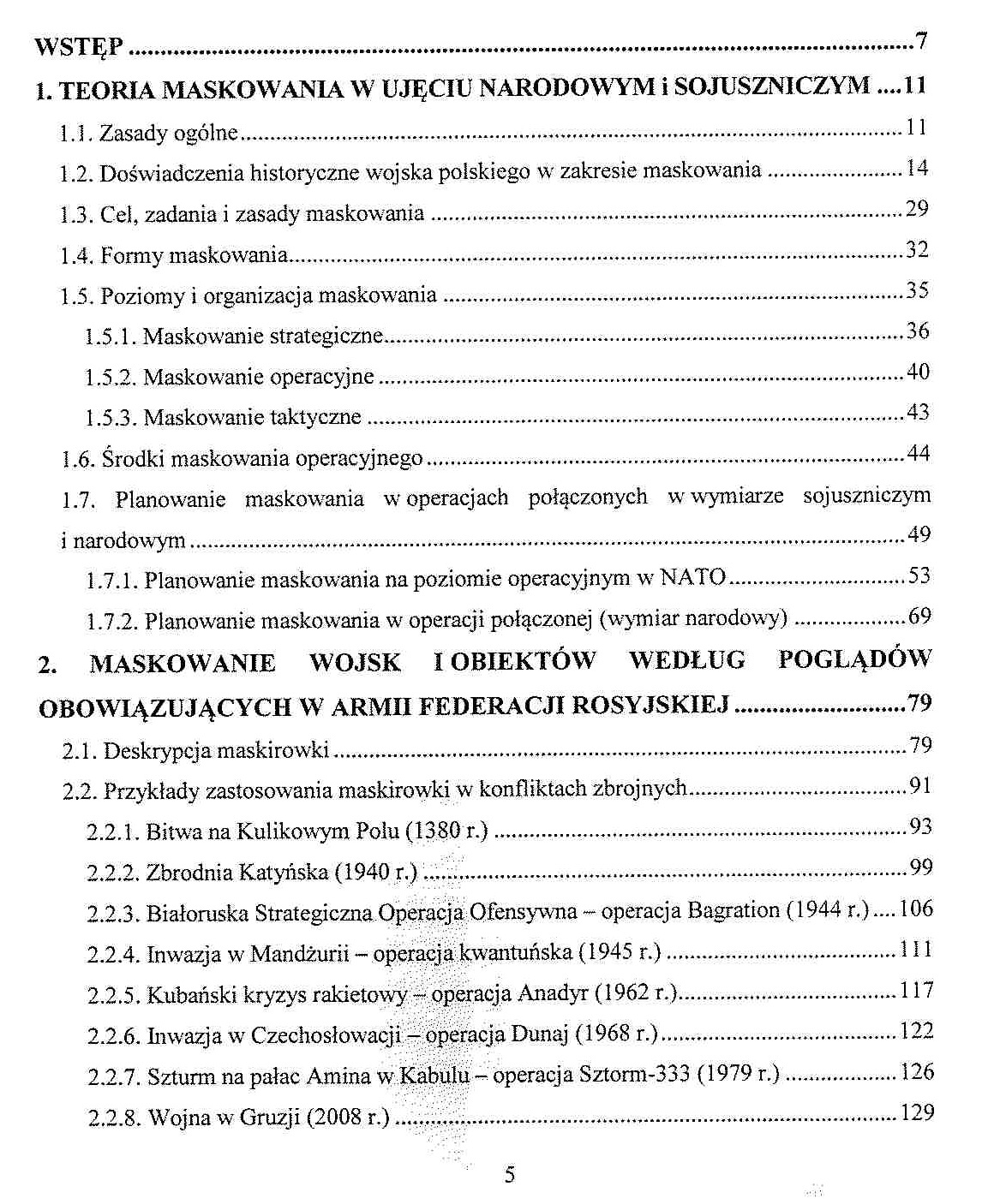 Autorzy podejmują rozważania dotyczące teorii maskowania w ujęciu narodowym i sojuszniczym. Przedstawiono ogólne zasady maskowania oraz doświadczenia historyczne wojska polskiego, Federacji Rosyjskiej oraz Stanów Zjednoczonych w tym zakresie. Zaprezentowano również cel, zadania, zasady i formy maskowania oraz opisano poziomy i organizacje maskowania, opisano ponadto środki maskowania operacyjnego.