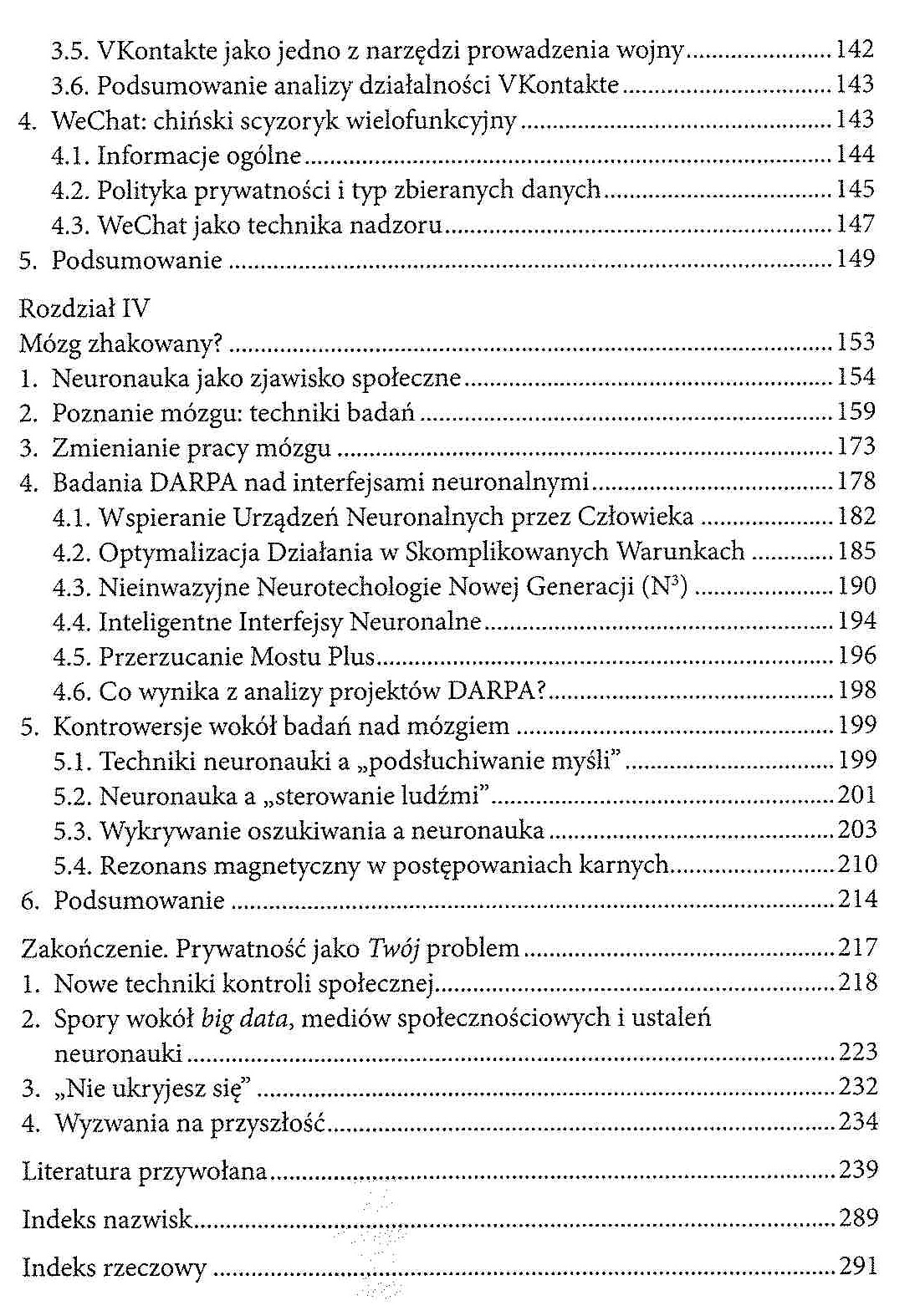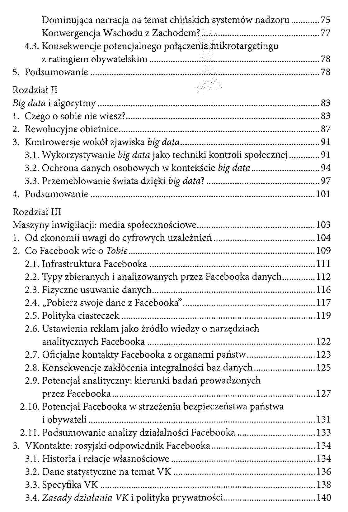 Książka dotyczy zmian w mechanizmach współczesnej kontroli społecznej. Są one opisywane na bazie rozważań nad powiązanymi ze sobą tytułowymi technologiami. Pierwsza z nich obejmuje wielkie, wciąż rosnące bazy danych i metody ich zautomatyzowanego przetwarzania oraz analizowania ich zawartości, czyli rozwiązania określane łącznie mianem big data. Drugi zbiór analizowanych technologii umożliwia działanie nowemu typowi mediów - mediów społecznościowych - które docierają do znaczącej i wciąż rosnącej części globalnej populacji. Trzeci typ technologii, last but not least, jest powiązany z jakościowymi zmianami wynikającymi z rozwoju nowych technik analizowania pracy mózgu. Autor pokazuje sploty między opisywanymi zjawiskami i procesami oraz dąży do ich rozplątania. Celem jest nie tylko rekonstrukcja kluczowych w zmieniającym się świecie trendów, ale również spojrzenie, dokąd nas one prowadzą.