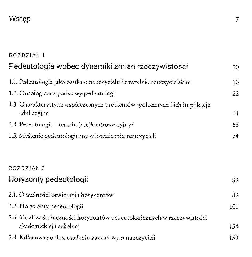 Książka jest autorskim podejściem do rozważań dotyczących zawodu nauczycielskiego, uwzględniających przede wszystkim dynamiczne zmiany rzeczywistości i związane z tym nowe konteksty działalności szkół i pracy nauczycieli. Obejmuje swoją tematyką miejsce tej subdyscypliny pedagogiki w przestrzeni akademickiej i szkoły oraz wskazuje na możliwości szerszego wykorzystywania jej osiągnięć w nauce i praktyce nauczycielskiej. Podkreśla również potrzebę aktywnej obecności nauczycieli w dalszym tworzeniu myśli pedeutologicznej, ale również samych siebie, co jest ważnym kierunkiem dla zadowalającego funkcjonowania w przyszłości. W książce są zatem scharakteryzowane autorskie horyzonty pedeutologii, wśród których można wskazać między innymi: fascynacje zawodem nauczycielskim; ontologiczne podstawy pedeutologii; myślenie pedeutologiczne w kształceniu nauczycieli; transformacje; przywództwo organizacyjne i naukowe pedeutologii; pedeutologiczną konsyderację; pedeutologię twórczości; pedeutologię empiryczną; przywództwo edukacyjne i naukowe; pedeutologiczną wyrazistość czy też horyzont eksperiencji. Monograa prezentuje zatem nowe podejście do rozważań o zawodzie nauczycielskim i jest zaproszeniem dla Czytelników do dialogu o zagubionych szansach dla zawodu nauczyciela, ale odkrywanych ponownie w poczuciu autonomiczności, doceniania wartości nauki i odnalezienia pewnych wskazówek dla wyzwalania nowej świadomości nauczycielskiej.