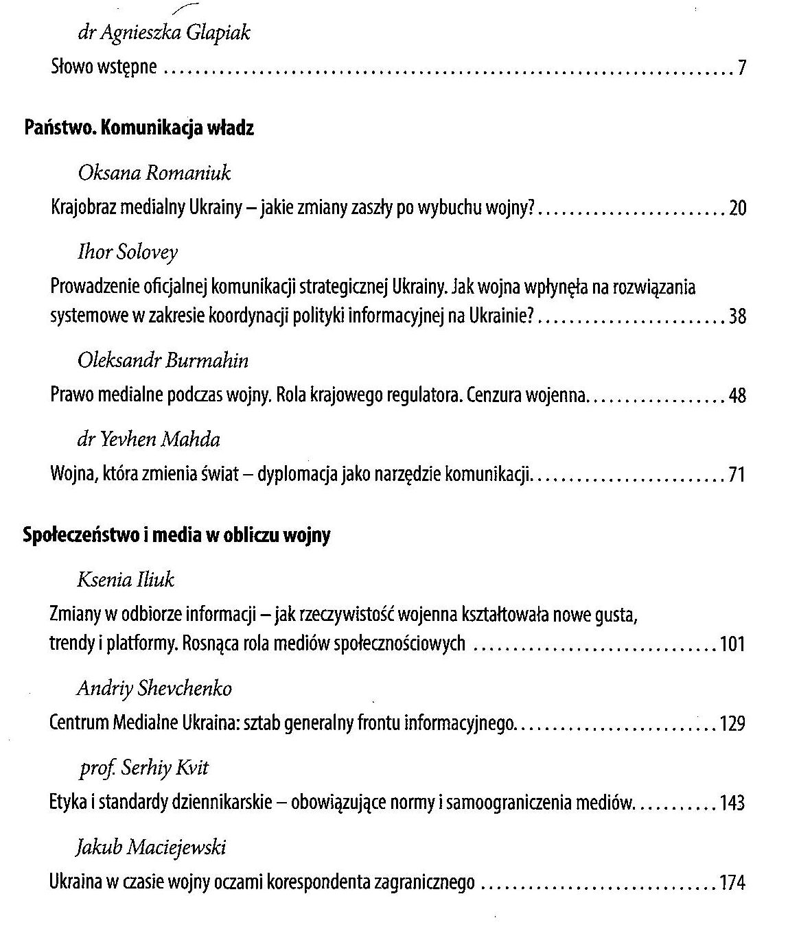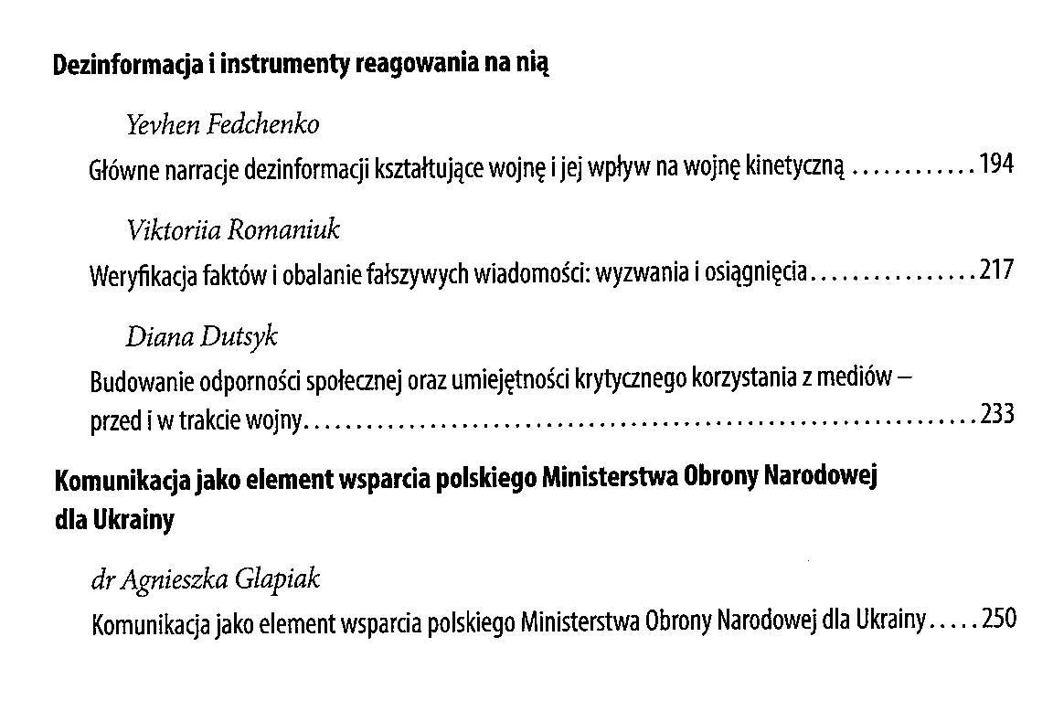 Informacja stanowi bez wątpienia bardzo ważny oręż we współczesnych konfliktach zbrojnych. Oczywiście propaganda i dezinformacja były używane podczas wszystkich wojen, jednak obecnie mamy do czynienia z jednym z najbardziej intensywnych w przestrzeni cyfrowej konfliktów w historii. Ukraińcy jako pierwsi w XXI w. zostali zmuszeni do pełnej mobilizacji swoich sił obronnych na tym polu walki. Doświadczyli oni, że środowisko informacyjne oraz infrastruktura komunikacyjna są jednymi z pierwszych atakowanych przez agresora. Na moje zaproszenie osobistymi doświadczeniami podzielili się wybitni ukraińscy eksperci, w tym m.in.: wiceminister obrony Ukrainy, członek Krajowej Rady Ukrainy ds. Telewizji i Radiofonii, medioznawcy z ukraińskich uczelni, przedstawiciele mediów i niezależni eksperci w zakresie środowiska informacyjnego. Zebrane w publikacji doświadczenia pierwszego roku wojny na Ukrainie stanowią niezwykle cenny wkład w naukę. Szczególnie, że dobór autorów pozwolił na holistyczne ujęcie różnych obszarów związanych z komunikacją - od administracji państwowej, poprzez media, organizacje pozarządowe, po zmiany zachodzące w społeczeństwie ukraińskim. Jest to więc pierwsze tak kompleksowe opracowanie na polskim rynku dotyczące doświadczeń komunikatorów z wojny na Ukrainie. Prezentowane opinie zawierają cechy wspólne, ale pojawiają się też rozbieżne osobiste obserwacje, co czyni tę publikację jeszcze cenniejszą. Wszyscy autorzy przypominają, że wojna w Ukrainie rozpoczęła się w 2014 r. Dlatego w 2022 r. Ukraińcy dobrze wiedzieli, że kolejny atak jest ich "być albo nie być". I choć nie wszystkie działania kończą się sukcesem, widzimy, że nasi sąsiedzi skorzystali ze swoich trudnych doświadczeń i wykazali się ogromną determinacją w dążeniu do odparcia rosyjskich ataków. Z lektury artykułów nasuwa się wniosek, jak mało wiemy o tej wojnie. Jesteśmy przekonani, że współczesne media mogą przekraczać wszystkie granice, bo ziemię okrążają liczne satelity, a internet jest wszędzie, w praktyce jednak niewiele do nas dociera. Dlaczego tak się dzieje? Na to pytanie odpowiedzi udzielają autorzy tekstów. ze Wstępu