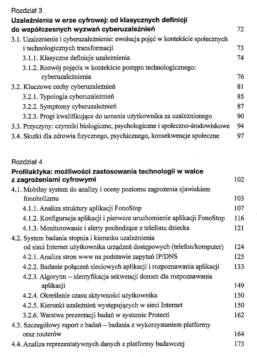 Książka podejmuje tematykę cyberuzależnień oraz możliwości zastosowania technologii w walce z zagrożeniami cyfrowymi, łącząc w elastyczny sposób perspektywę badawczą nauk o komunikacji społecznej i mediach, psychologii, pedagogiki oraz nauk o bezpieczeństwie. Wyjaśnia istotę, znaczenie i uwarunkowania tożsamości w erze cyfrowej: między rzeczywistością a wirtualnością oraz wykorzystanie technologii jako stymulatora niezależności i jednocześnie źródła zagrożeń dla młodego pokolenia. W monografii przedstawiono Internet i cyfryzację w świetle teorii ponowoczesności. Opisano główne przyczyny, symptomy oraz skutki uzależnień cyfrowych. Zaprezentowano działanie innowacyjnej aplikacji monitorującej aktywność online, wspierającej profilaktykę uzależnień z wbudowanymi automatycznymi algorytmami rekomendacji działań i prewencji zagrożeń.