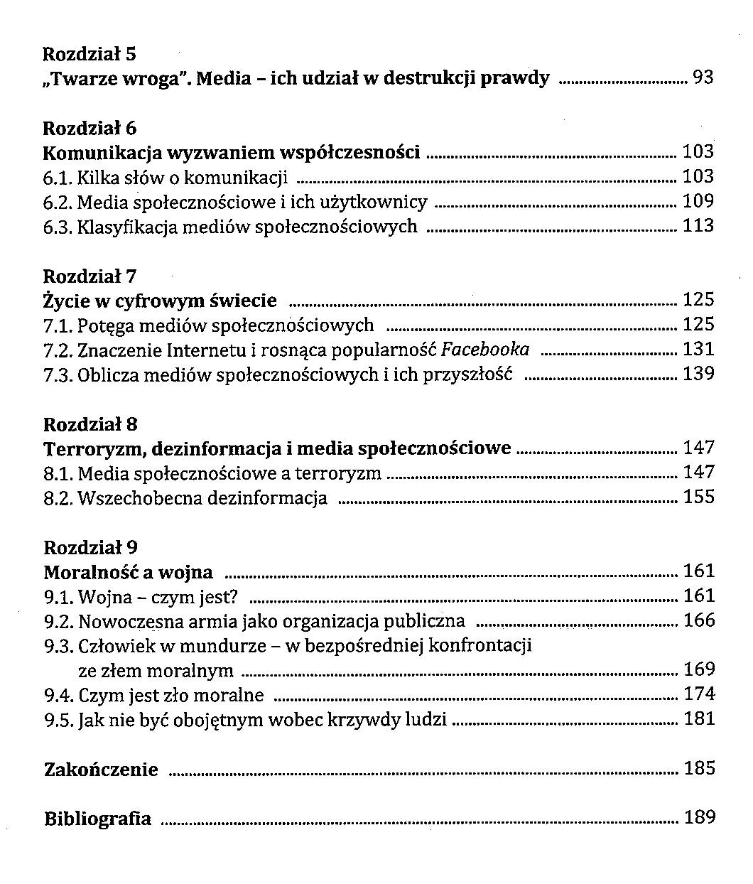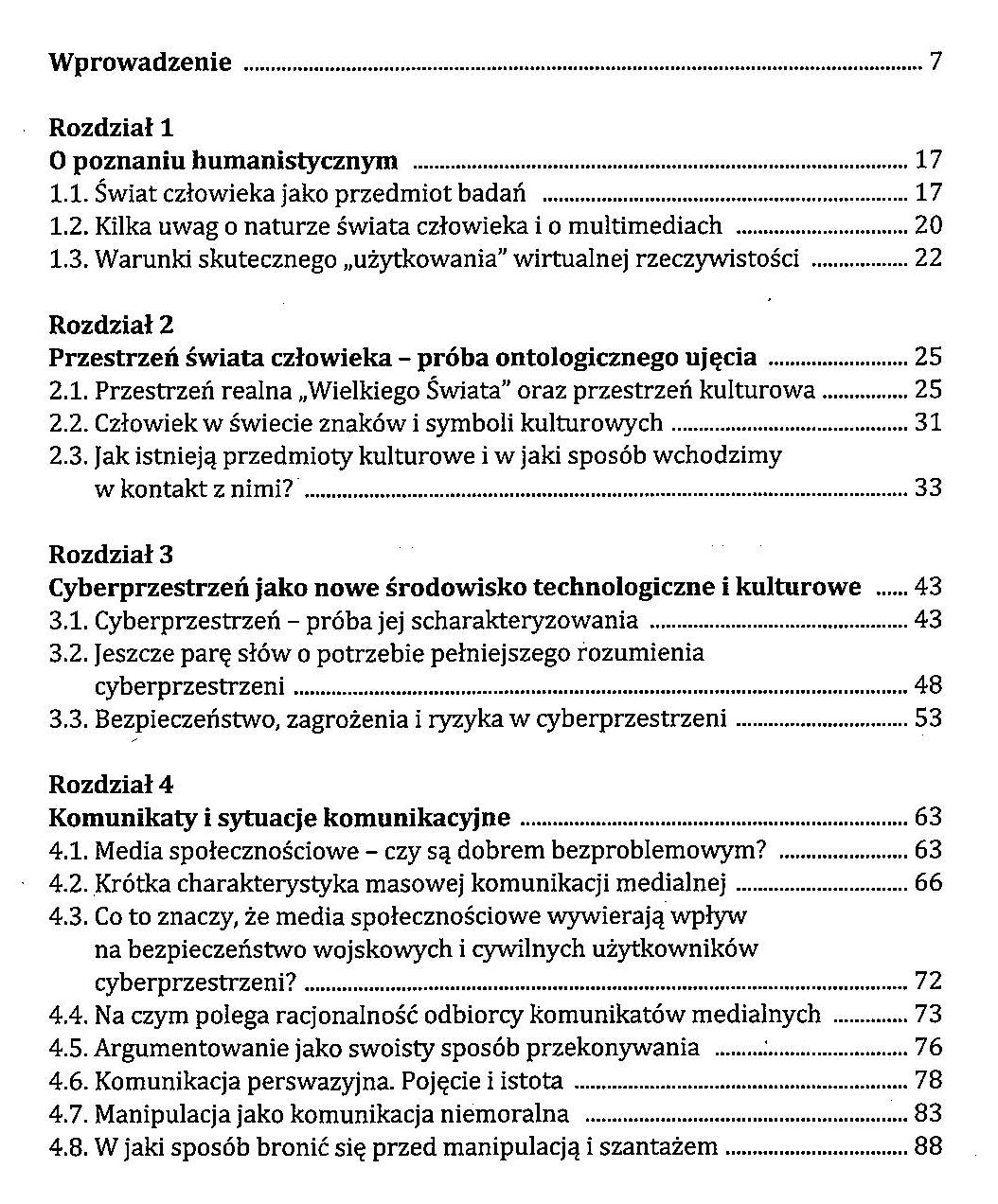 Monografia Człowiek wobec szans i zagrożeń generowanych w wirtualnym świecie koncentruje się wokół zagadnienia, którym jest aktywność jednostek i grup społecznych w cyberprzestrzeni jako rzeczywistości swoistej. Rozpatrywanie tak ogólnego problemu badawczego wymagało podzielenia go na szczegółowe kwestie i pytania. Korzystając z możliwości postawienia własnych pytań i z prawa do przyjęcia własnych danych wyjściowych, które to możliwości zaistniały w filozofii szczególnie silnie bezpośrednio po "przewrocie antypozytywistycznym" i które współcześnie wyrażają się w autonomistycznym nurcie badań nad światem kultury, główny problem tej monografii, wyrażony w jej tytule, rozpatrywany jest z kilku perspektyw szczegółowych. Pierwsza - ontologiczna - proponuje podejście do rzeczywistości wirtualnej jako do szczególnego rodzaju bytu, mianowicie jako do bytu intencjonalnego; druga - aksjologiczna - interpretuje ją jako świat, w którym "zadomowiły się" wartości i antywartości; trzecia - wskazuje na kryteria i na możliwości uzasadniania wyborów wartości moralnych; czwarta przekonuje o potrzebie stosowania w procesie wyjaśniania rzeczywistości "trójkąta Ajdukiewicza", to jest schematu: świat - umysł - język - jako odpowiedzialnego podejścia do pojęciowego i pozapojęciowego poznawania rzeczywistości kulturowej; czwarta - pokazuje cyberprzestrzeń jako "nosicielkę" informacji; piąta - wskazuje na rolę samodzielnego, systemowego, krytycznego myślenia jako środka obrony przed zagrożeniami środowiska życia, szósta - analizuje znaczenie i funkcje mediów społecznościowych, siódma - akcentuje szczególną potrzebę bezpieczeństwa personalnego i strukturalnego w cyberprzestrzeni; ósma - śledzi historię rozwoju rzeczywistości wirtualnej i wzrost poziomu wykorzystywania zasobów informacyjnych Sieci jako "narzędzia" przydatnego siłom zbrojnym.