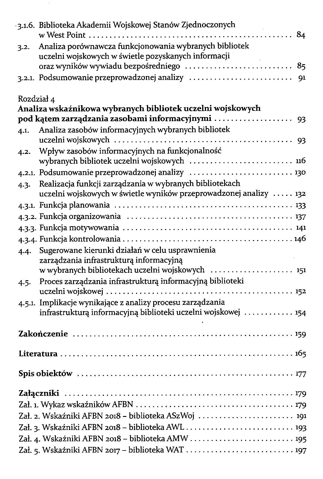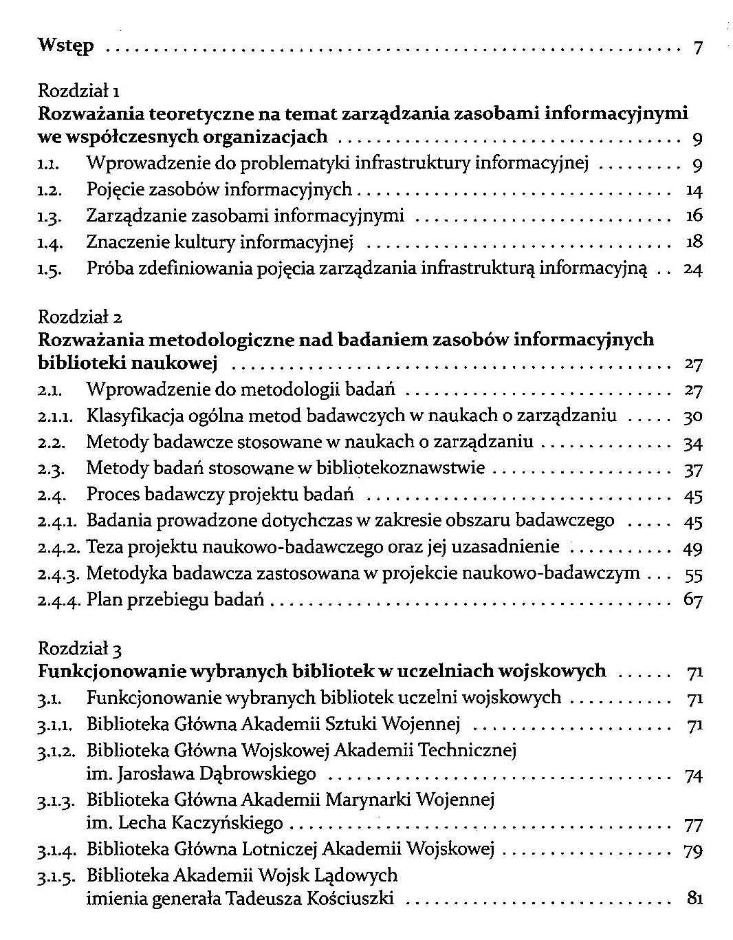 Niniejsza monografia opisuje odpowiednie zarządzanie zasobami informacyjnymi bibliotek uczelni wojskowych, które ma decydujący wpływ na rozwój tego typu organizacji, szczególnie dziś, w epoce cyfryzacji. Odpowiednie zarządzanie oznacza wspieranie procesów naukowo-badawczych i edukacyjnych, działań dydaktycznych promujących naukę, a także promocję i popularyzowanie biblioteki szkoły wyższej – jej zbiorów, zasobów informacyjnych i usług. Monografia zawiera problematykę badawczą skoncentrowaną wokół dwóch głównych hipotez, w których założono, że przy wykorzystaniu wybranych metod można wskazać rozwiązania usprawniające zarządzanie zasobami informacyjnymi biblioteki uczelni wojskowej oraz, że możliwe jest wskazanie interakcji zachodzących między funkcjami zarządzania w bibliotece uczelni wojskowej. Obie hipotezy zostały zweryfikowane poprzez uzyskane wyniki analizy porównawczej oraz wskaźnikowej przeprowadzonej w wybranych bibliotekach przy zastosowaniu zarówno metod pragmatycznych, jak i formalnych, o charakterze zarówno ilościowym, jak i jakościowym, a także studium przypadku.