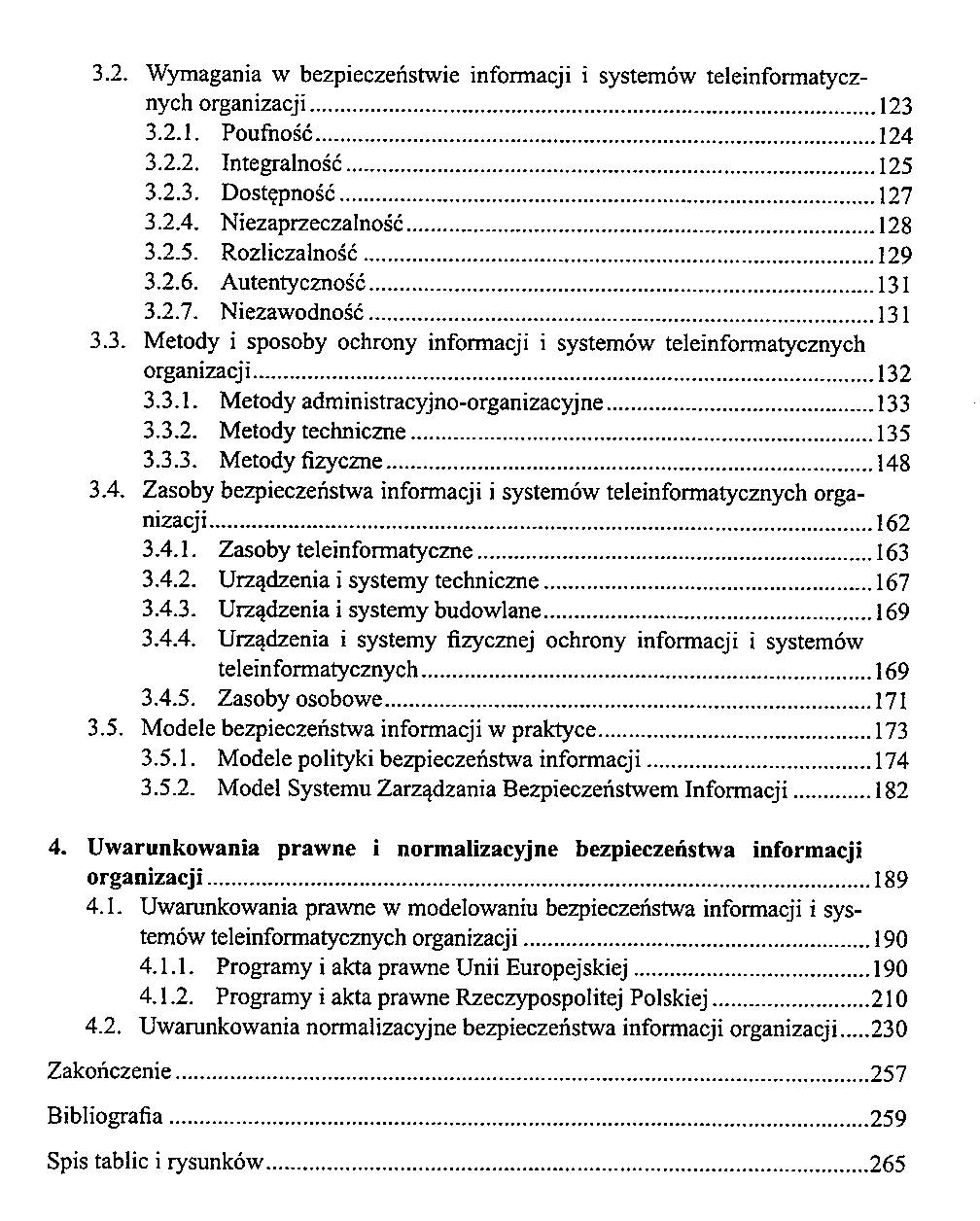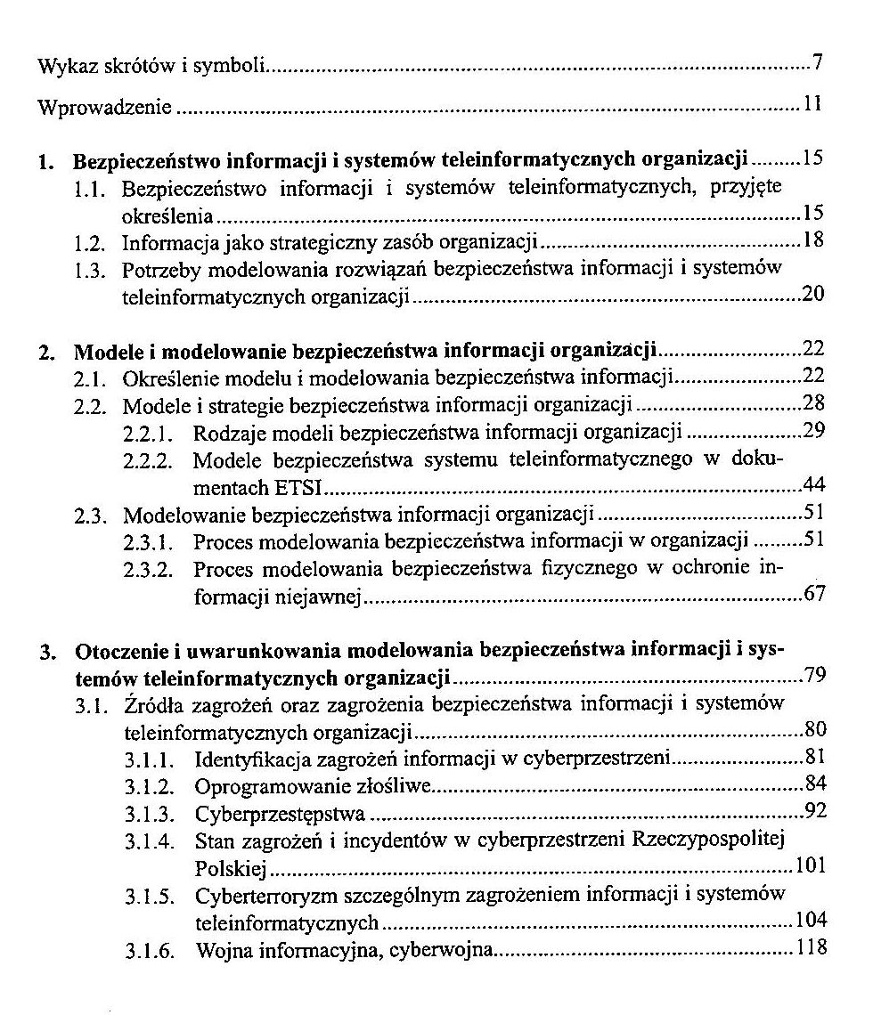 W książce zaprezentowano problemy związane z modelowaniem bezpieczeństwa informacji, głównie w postaci polityki bezpieczeństwa informacji organizacji. Szczególny akcent położono na uwarunkowania i otoczenie procesu modelowania bezpieczeństwa informacji i systemów teleinformatycznych organizacji oraz uwarunkowania prawne i normalizacyjne warunkujące ten proces. W rozdziale pierwszym przedstawiono określenia przyjęte na potrzeby prezentacji uzyskanych wyników badawczych. Zwrócono uwagę na znaczenie informacji jako zasobu strategicznego we współczesnej organizacji oraz zaprezentowano potrzeby modelowania rozwiązań bezpieczeństwa informacji i systemów teleinformatycznych organizacji. W rozdziale drugim zaprezentowano określenia związane z modelami i modelowaniem bezpieczeństwa informacji organizacji oraz istniejące i sprawdzone w praktyce modele i strategie bezpieczeństwa informacji. Szczególną uwagę zwrócono na prezentację procesu modelowania bezpieczeństwa informacji organizacji. W rozdziale trzecim przedstawiono uwarunkowania wywierające wpływ na modelowanie rozwiązań bezpieczeństwa informacji. Szczególną uwagę zwrócono na źródła zagrożeń i zagrożenia bezpieczeństwa informacji, wymagania stawiane bezpieczeństwu informacji, stosowane metody oraz sposoby ochrony informacji i systemów teleinformatycznych organizacji, a także na zasoby organizacji, które wywierają wpływ na modelowanie takich rozwiązań, oraz praktyczne modele bezpieczeństwa informacji, w tym modele polityk bezpieczeństwa informacji oraz systemu zarządzania bezpieczeństwem informacji. W rozdziale czwartym omówiono aktualnie obowiązujące dokumenty prawne i standaryzacyjne (normy) dotyczące bezpieczeństwa informacji oraz systemów teleinformatycznych organizacji i modelowania rozwiązań w tym zakresie.