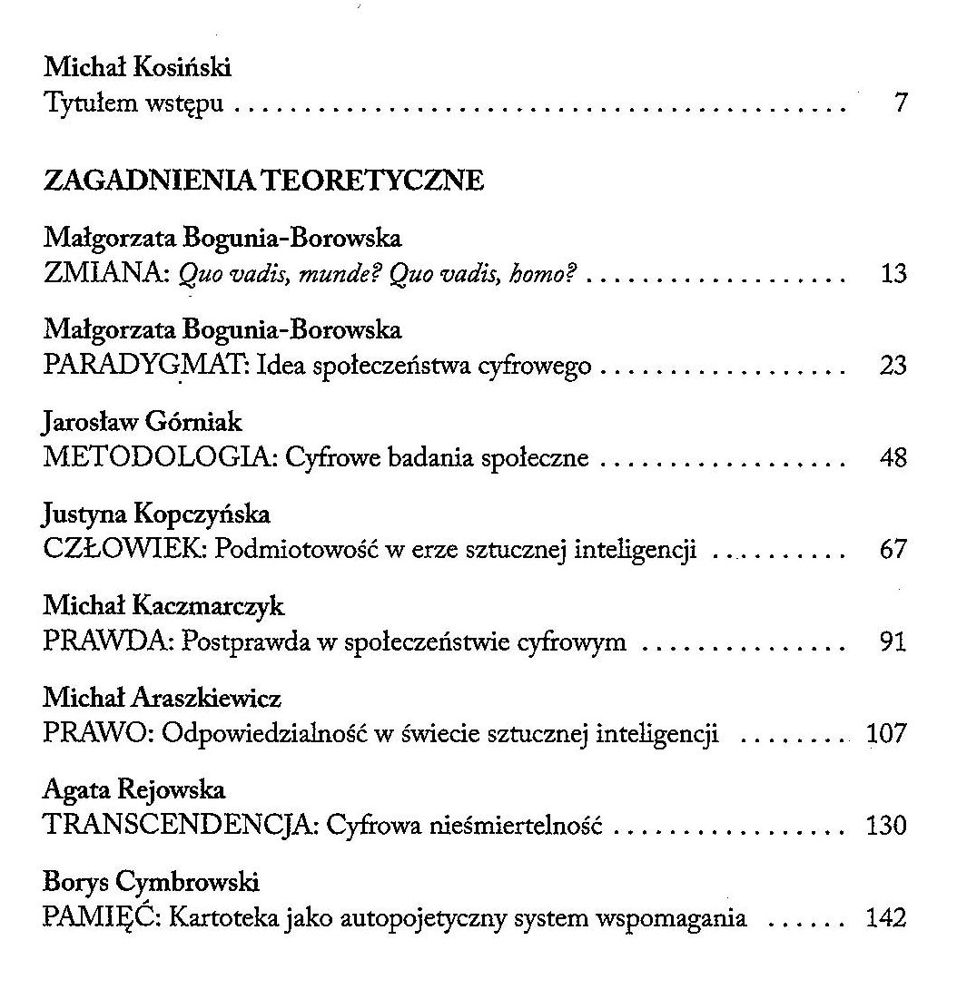 Zrozumienie zmian społecznych wywołanych przez rewolucję cyfrową możliwe jest tylko poprzez zintegrowanie spostrzeżeń formułowanych w obrębie socjologii, prawa, ekonomii, psychologii i wielu innych dziedzin współczesnej nauki. Perspektywa interdyscyplinarna pozwala rozwinąć holistyczne rozumienie dzisiejszych wyzwań i opracować rozwiązania, które są gruntownie przemyślane, kompleksowe i skuteczne. Zbiór wykładów akademickich Społeczeństwo cyfrowe wpisuje się w globalne trendy naukowe, wspierając interdyscyplinarne badania i dialog międzydziedzinowy. Książka wzmacnia zarówno akademickie, jak i praktyczne rozumienie transformacji cyfrowej, wnosząc znaczący wkład w dyskusję na temat naszej przyszłości. (prof. Michał Kosiński) [nota wydawcy].
