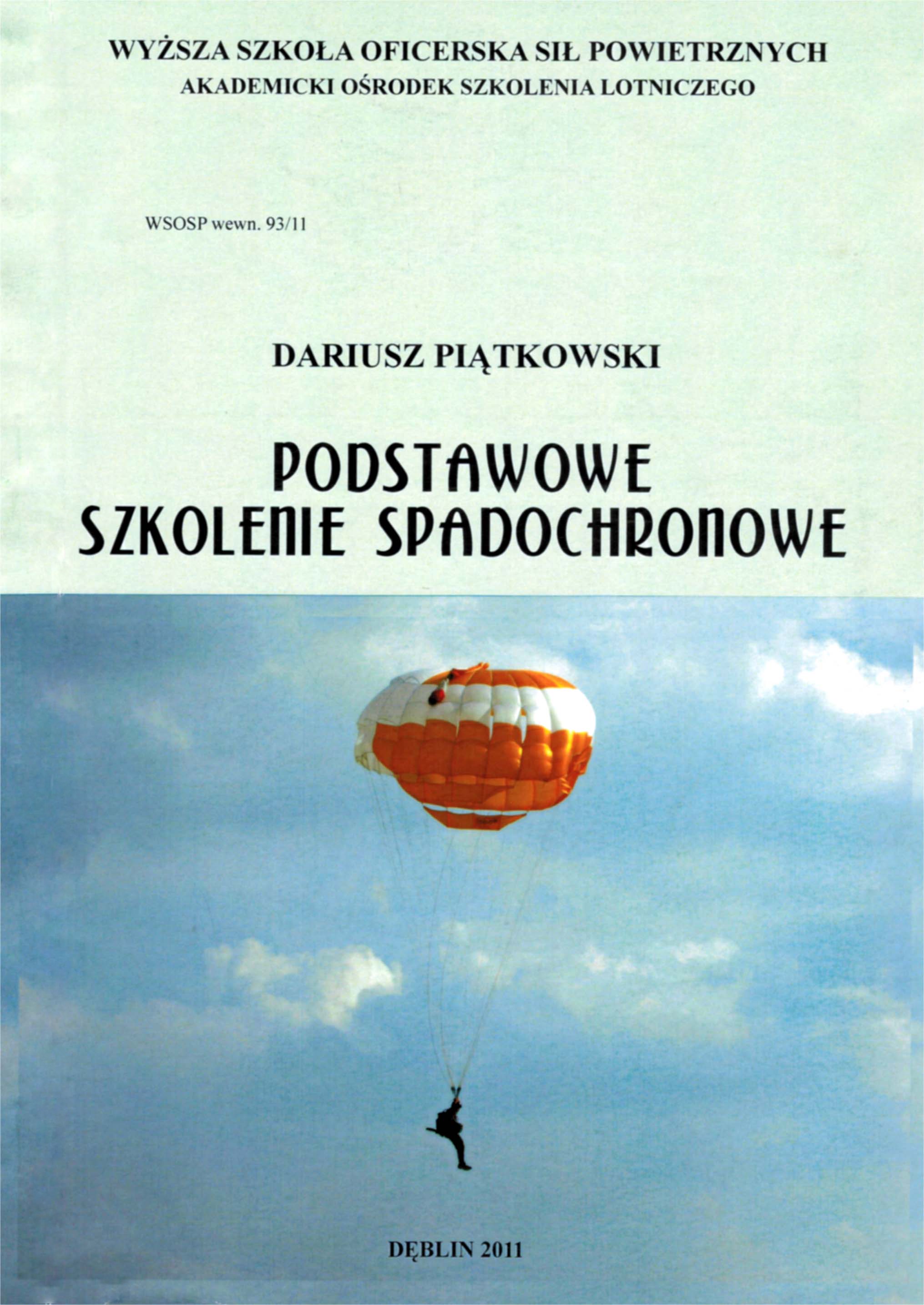 Streszczenie: Zarys historii spadochroniarstwa. Podstawowa teoria skoku spadochronowego. Budowa spadochronów. Spadochron szkolno-treningowy L-2 "Kadet". Spadochron zapasowy AZ-95M. Użytkowanie i konserwacja spadochronów. Technika skoku ze spadochronu. Procedury awaryjne. Organizacja skoków spadochronowych.