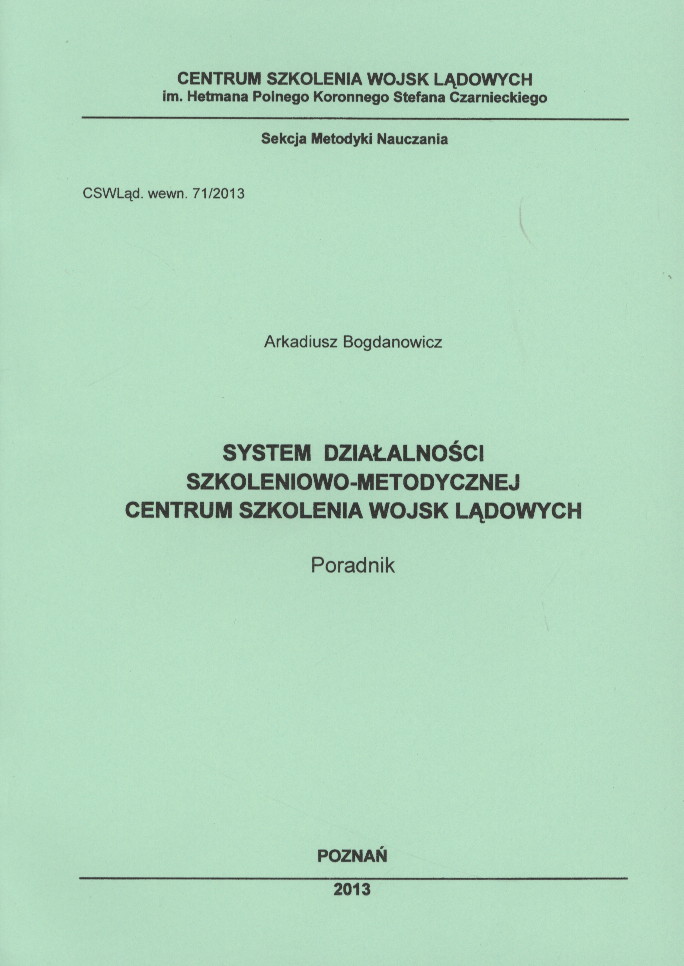 Streszczenie: Zapisy niniejszejgo poradnika oparto na aktualnie obowiązujących treściach Szkol. 806/2009. Nowe jakościowo zadania wojsk lądowych stawiają przed wykładowcami, instruktorami i dowódcami poszczególnych szczebli dowodzenia bardzo wysokie wymagania. Zakładane efekty szkolenia zostaną osiągnięte jedynie wówczas gdy odpowiednio pod względem metodycznym zaplanowany będzie proces szkolenia
