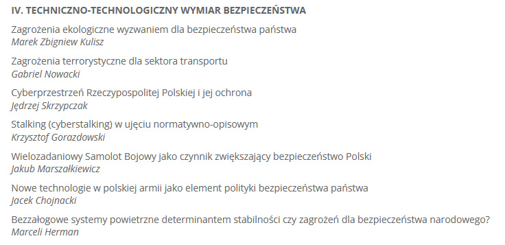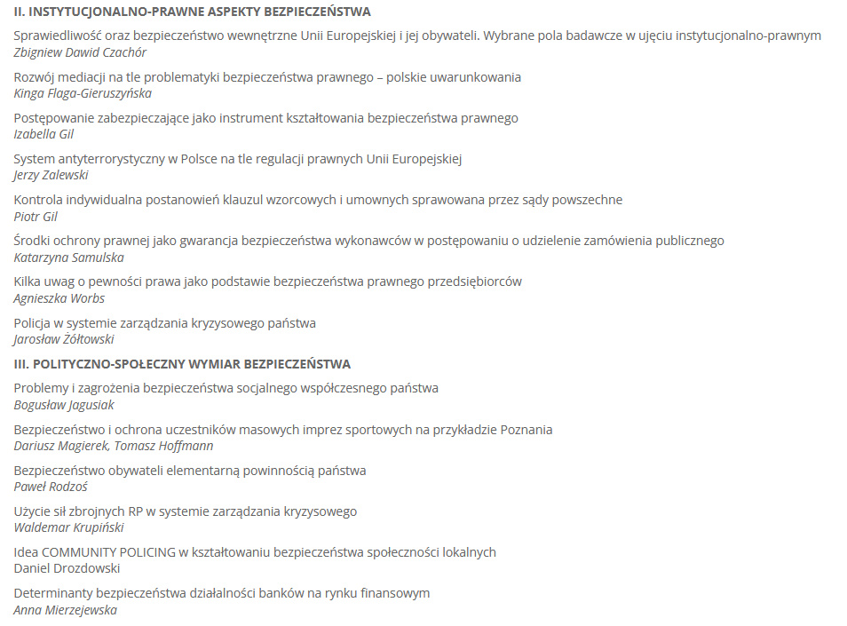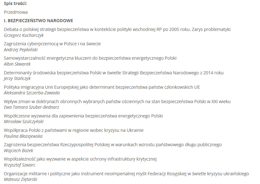Streszczenie: Książka porusza aktualną problematykę bezpieczeństwa narodowego Polski. Zagadnienie to nabiera szczególnego znaczenia w kontekście dynamicznych zmian w otoczeniu międzynarodowym. Publikacja opiera się na interdyscyplinarnym i multidyscyplinarnym podejściu do przedmiotowej problematyki, bazując na analizie aktualnego stanu bezpieczeństwa narodowego w wymiarze wewnętrznym, z uwzględnieniem zewnętrznych determinantów zmian w perspektywie nauk humanistycznych, ekonomicznych, prawnych, wojskowych itd. Połączenie teoretycznej analizy wskazanych zagadnień z ich praktycznym wymiarem pozwoliła uzyskać wielowymiarową ocenę stanu bezpieczeństwa państwa i jego uwarunkowań natury wewnętrznej i zewnętrznej.