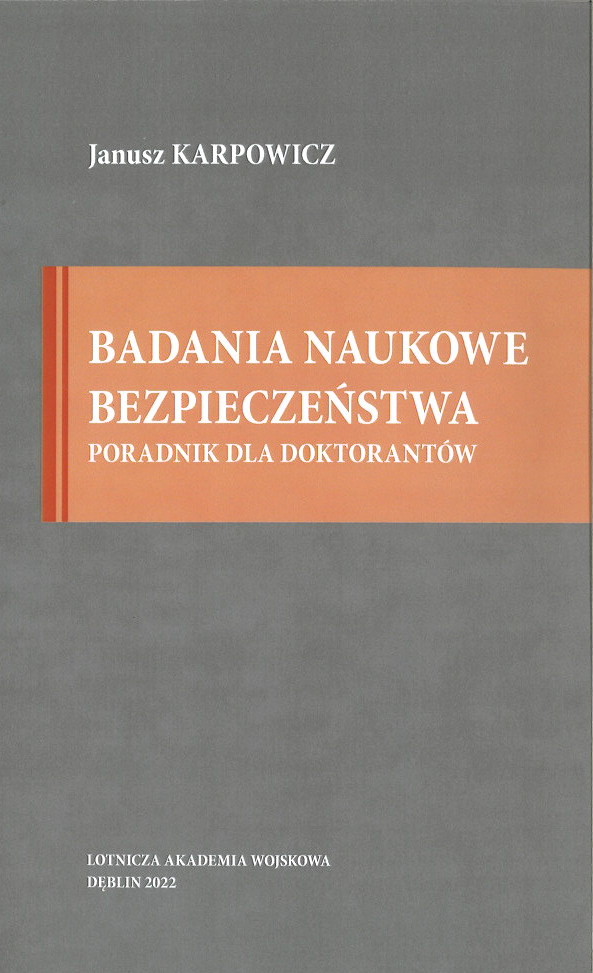 Badania naukowe bezpieczeństwa : poradnik dla doktorantów / Janusz Karpowicz. - Dęblin : Lotnicza Akademia Wojskowa, 2022. - 282, [2] strony : tabele (w tym kolorowe) ; 24 cm.