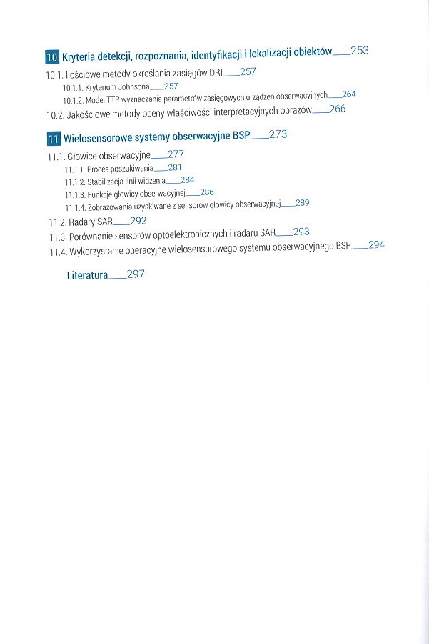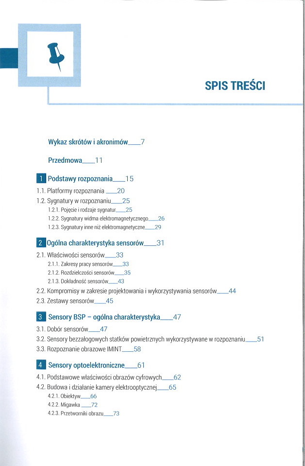 W podręczniku ograniczono się do tematyki związanej z pozyskiwaniem danych technicznych obejmującej sensory wykorzystywane na pokładach bezzałogowych statków powietrznych, dostarczające informacje rozpoznawcze w postaci obrazów. Publikacja jest próbą zapełnienia luki i przedstawienia stosowanych na BSP sensorów obrazowych.