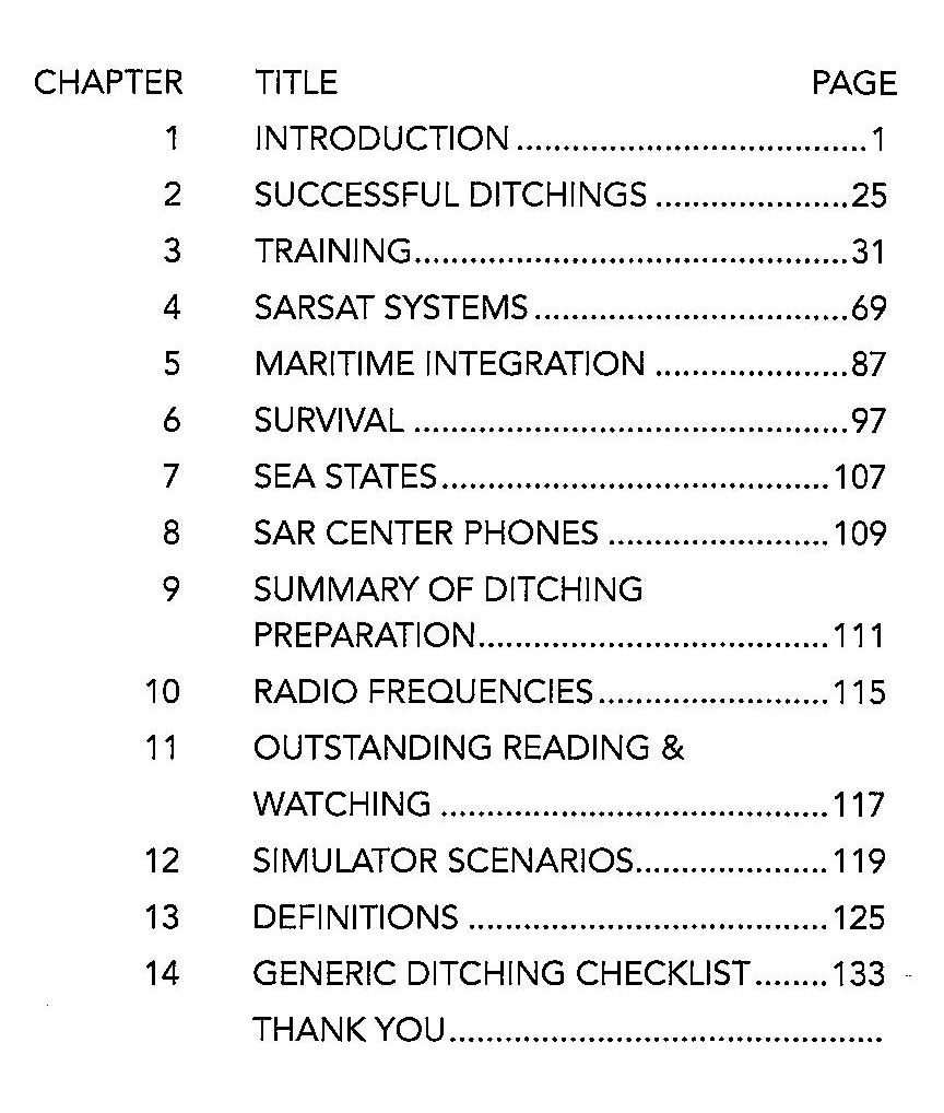 Profesjonalni piloci mają wiedzę na poziomie doktoratu dotyczącą lotnictwa. Spędzają lata na nauce wszystkich aspektów lotnictwa, od przepisów federalnych, przepisów międzynarodowych, procedur komunikacyjnych, procedur awaryjnych, procedur przyrządowych, podręczników lotu, podręczników firmowych, procedur operacyjnych i wreszcie technik wykonywania swojej pracy. Istnieje jednak procedura awaryjna, wokół której się szkoli (członkowie załogi uczą się początku i końca), ale bardzo rzadko poświęcają czas na zajmowanie się ćwiczeniem w czasie rzeczywistym tego, co wydarzy się podczas wodowania. Wszyscy członkowie załogi uczą się, jak zabezpieczyć uszkodzony silnik. Lub jak poradzić sobie z awarią elektryczną. Lub kontrolować upust powietrza w przypadku problemu z pneumatyką. Uczą się również, jak wyjść z samolotu w wodzie w przypadku wodowania. I jak wdrapywać się na tratwy, a w niektórych przypadkach, jak wdrapywać się do kosza na helikopter. Jednak niewielu członków załogi kiedykolwiek przepracowało scenariusz awarii silnika na wysokości do kontaktu z wodą. Ta książka zaczyna się od koncepcji, że żaden pilot nie jest zbyt doświadczony ani zbyt stary, aby nauczyć się nowej lekcji. Koncepcję tę najlepiej ilustruje praca kapitana Ala Haynesa. Kapitan Haynes był pilotem dowodzącym poważnie uszkodzonym DC-10, który rozbił się w Sioux City w 1989 roku. 184 osoby przeżyły lądowanie wbrew wszelkim przeciwnościom. Kapitan Haynes rozpoczął karierę mówcy, a wiele lat później belgijski kapitan Eric Gennotte wziął udział w jednym z wykładów. W 2003 roku kapitan Gennotte leci airbusem startującym z Bagdadu. Samolot zostaje trafiony pociskiem, lewy silnik staje w płomieniach, a części skrzydła płoną. Airbus traci całą hydraulikę i kontrolę nad powierzchniami lotu. Gennotte leci odrzutowcem, stosując techniki nauczone przez Haynesa i sprowadza samolot z powrotem na lotnisko, aby bezpiecznie wylądować. W 2009 roku wszyscy widzieliśmy wideo dużego samolotu pasażerskiego bezpiecznie lądującego na rzece Hudson w Nowym Jorku. Wizualny dowód na to, że lądowanie na wodzie jest możliwe. Książka obejmuje również wiele innych udanych wodowań z ostatnich 55 lat. Książka dzieli szkolenie w zakresie wodowania na cztery fazy, zaczynając od nauki w domu lub przedmiotów objętych formalnym szkoleniem. Ostatnie fazy szczegółowo omawiają ostatnie 1000 stóp przed lądowaniem i ostatnie 100 stóp do kontaktu. Autor pisze na podstawie swoich doświadczeń z lądowania Lake Seawolf w środowisku offshore podczas programu testowego USAF. Doświadczenia te pozwalają mu szczegółowo opisać, co pilot zobaczy, gdy samolot będzie pokonywał ostatnie 1000 stóp zniżania. Ten poziom szczegółowego szkolenia nigdy wcześniej nie był publikowany. Piloci są dziś świadomi 406-megahercowego nadajnika lokalizatora awaryjnego. W rozdziale poświęconym systemom SARSAT dowiedzą się, jak nadajnik komunikuje się z satelitami, które komunikują się ze stacjami naziemnymi, które komunikują się z centrami koordynacji ratowniczej, które komunikują się z centrami dowodzenia misją, skąd mogą zostać wysłane siły ratownicze. A ten system działa na całym świecie, komunikując się z siłami ratowniczymi na sześciu kontynentach.Jeśli płatowiec rozbije się nad otwartym oceanem lub na północy na pokrywie lodowej, kto zabierze załogę i pasażerów? Rozdział poświęcony integracji morskiej z poszukiwaniami i ratownictwem przedstawia podstawowe kroki, dzięki którym straż przybrzeżna lub siły ratownicze mogą znaleźć łódź na wodzie, aby wysłać ją na ratunek. W książce znajduje się przykładowy scenariusz symulatora dla działów szkoleniowych. Jeden scenariusz zakłada szybką reakcję wodowania (pożar na pokładzie), a drugi scenariusz zakłada dryfowanie w dół (intensywne uszkodzenia spowodowane gradem). Scenariusze są tworzone z myślą o realizmie i wartości szkoleniowej. Ogólne listy kontrolne wodowania są przeznaczone dla załóg latających bez określonej listy kontrolnej wodowania. Książka kończy się słownikiem definicji lotniczych dla laików i początkujących pilotów studiujących wodowanie. Profesjonalne załogi przelatujące dziś przez stawy są dobrze zorientowane w APU, CPDLC, HMG, GMDSS, EICAS, PACOTS i RVR? ale wielu czytelników zgubi się w żargonie.