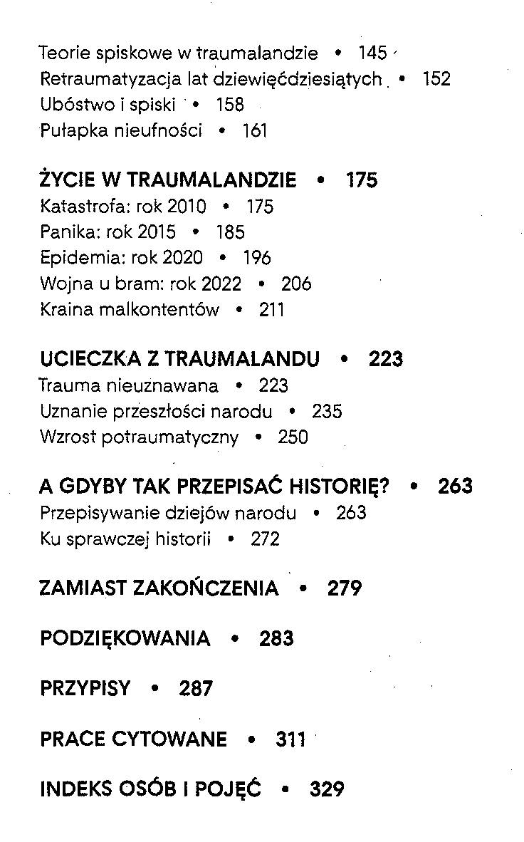 Nieufni wobec państwa i wszelkich instytucji. Wiecznie narzekający i niezadowoleni. Pełni obaw i lęków. A jednocześnie gotowi do ogromnej mobilizacji w czasie kryzysu i pomagania innym, gdy są w potrzebie. Tacy są mieszkańcy Traumalandu. Michał Bilewicz zaprasza do zgłębienia społecznej psychologii Polaków. Pokazuje, że nie jesteśmy unikalni. Podobnie jak inne historycznie straumatyzowane narody przystosowaliśmy się do trudnych warunków, w których przyszło żyć naszym przodkom. Czy jednak jesteśmy skazani na ciągłe przypominanie trudnej historii? Czy istnieje droga wyjścia ze świata lęków i nadwrażliwości? [nota wydawcy]