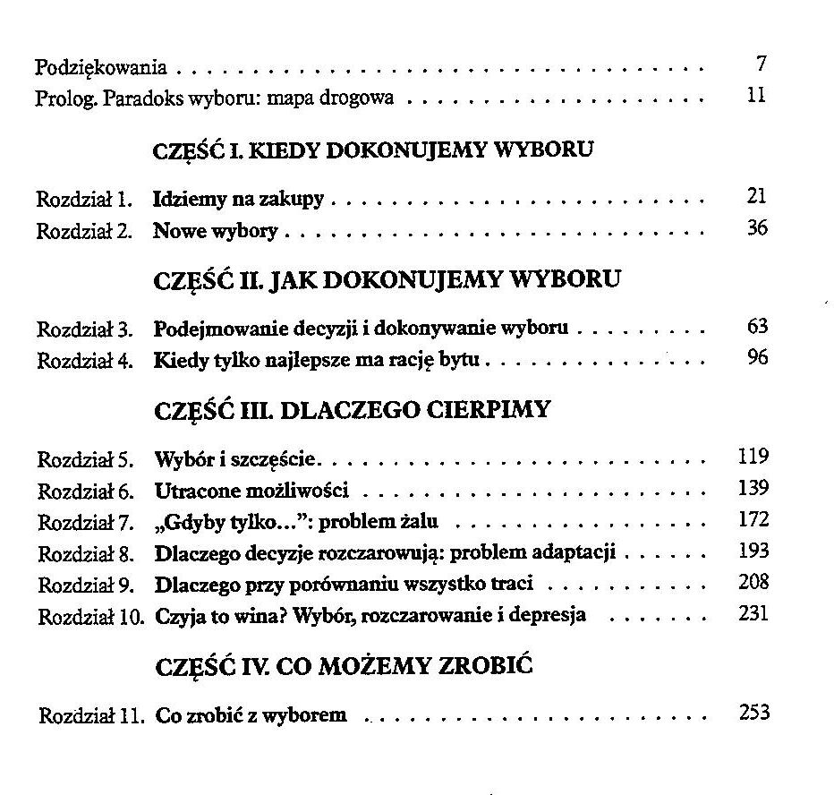 "Kiedy ludzie nie mają wyboru, życie jest wręcz nie do zniesienia. Ponieważ ilość dostępnych wyborów wzrasta - tak, jak w naszej kulturze konsumpcjonizmu - autonomia, kontrola oraz wyzwolenie wniesione przez tę różnorodność są potężne i pozytywne. Ale, ponieważ ilość wyborów ciągle rośnie, zaczynają pojawiać się negatywne aspekty posiadania wielości wyborów. Kiedy ilość możliwości dalej wzrasta, te negatywy eskalują, aż w końcu jesteśmy nim przeciążeni. W tym miejscu, wybór wcale już nie uwalnia, ale osłabia. Można nawet rzecz, że tyranizuje".Fragment książkiKażdy z nas, każdego dnia konfrontuje się z trudną do oszacowania liczbą mniej lub bardziej istotnych dylematów. Stojąc na rozdrożu, analizujemy alternatywy i wcześniej czy później decydujemy się na wybór jednej opcji, odrzucając pozostałe. Czy jest to wybór najlepszy z możliwych? Czy wzięliśmy pod uwagę dostateczną liczbę alternatyw? Czy czegoś nie przeoczyliśmy? Te i inne pytania drążą umysł przeciętnego decydenta nie tylko przed dokonaniem wyboru, ale także po podjętej decyzji. Nierzadko towarzyszy temu obniżenie nastroju, uczucie rozczarowania i żalu. Czasem wewnętrzne głosy wyrażające wątpliwości nie milkną nawet po wielu latach. Dlaczego tak jest i jak możemy sobie z tym poradzić? Właśnie na tych kwestiach skupił się w Barry Schwartz w swojej książce "Paradoks wyboru".Autor w przystępny sposób wprowadza Czytelnika w meandry psychologicznychmechanizmów podejmowania decyzji, dowodząc, że głównym źródłem trosk i napięć jest nadmiar możliwości wyboru. Z żelazną konsekwencją wykazuje, że aby zwiększyć osobistą satysfakcję związaną z procesem decyzyjnym, należy ograniczać zbiór rozważanych opcji.Książka jest godna polecenia zarówno osobom pasjonującym się psychologią, jak ispecjalistom z dziedzin pokrewnych, a więc ekonomistom, socjologom czy badaczom rynku.Z recenzji dr Pawła FortunyBarry Schwartz, ur. 1946 profesor psychologii ze Swarthmore College w Filadelfii. Autor wielu artykułów i książek, m.in.: The Battle for Human Nature: Science, Morality and Modern Life oraz The Costs of Living: How Market Freedom Erodes the Best Things in Life.