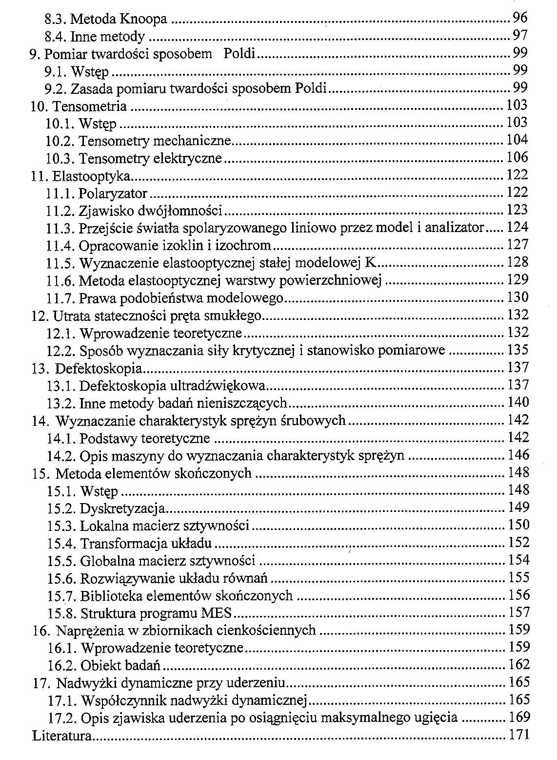 W pracy przedstawiono zagadnienia dotyczące właściwości mechanicznych materiałów oraz wytrzymałości i stateczności elementów konstrukcji. Skrypt jest przeznaczony przede wszystkim dla studentów wydziałów mechanicznych, a także budownictwa uczelni technicznych. Może być także przydatny dla inżynierów zajmujących się oceną wytrzymałości konstrukcji na podstawie badań eksperymentalnych.