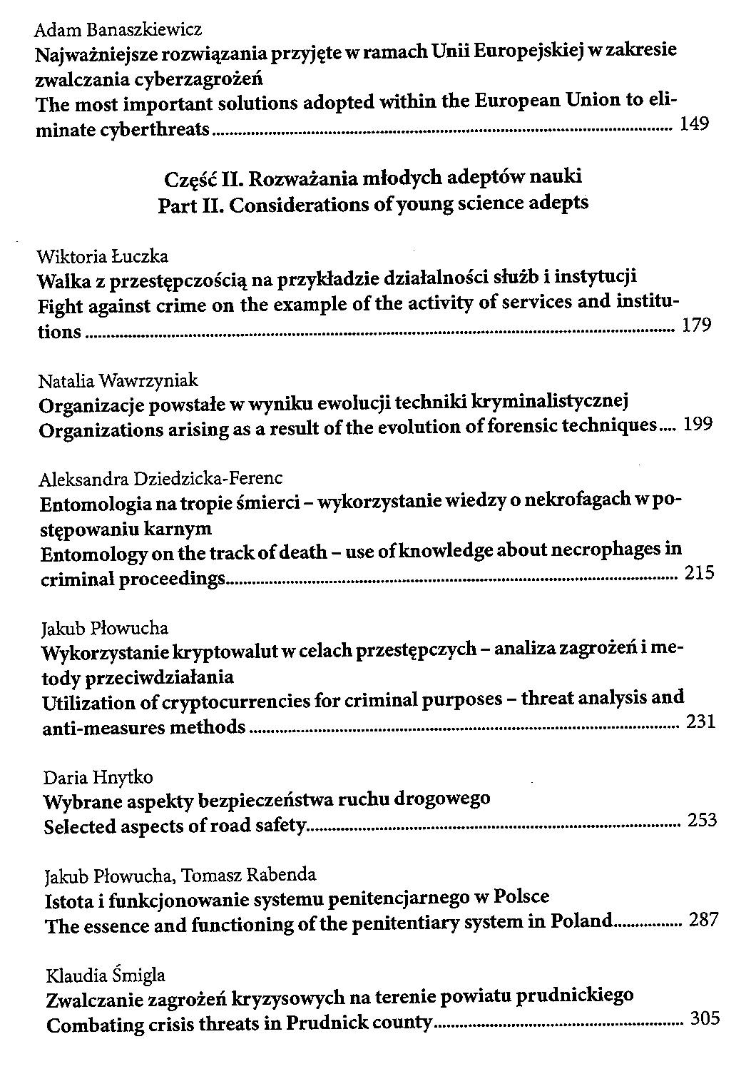 Na rynek wydawniczy trafia już ósmy tom z cyklu Vademecum Bezpieczeń stwa Wewnętrznego, tym razem poświęcony wybranym aspektom zwalcza nia zagrożeń. Tradycyjnie każdy tom Vademecum składa się z dwóch części. Część pierwsza zawiera rozważania kadry naukowej i praktyków, a część druga po święcona została na ukazanie wyników badań młodych adeptów nauki w wy branych aspektach procesu zapewniania bezpieczeństwa wewnętrznego