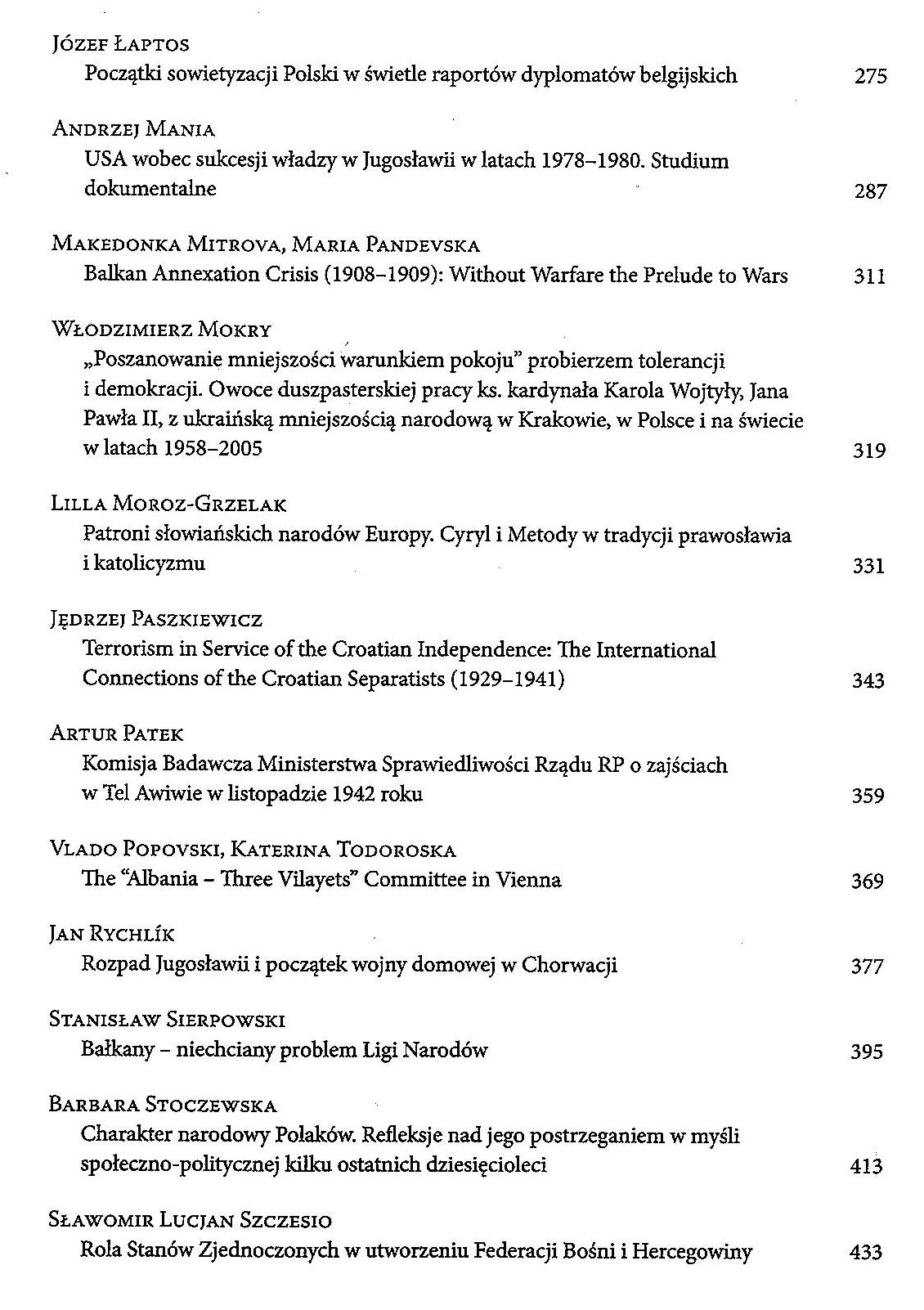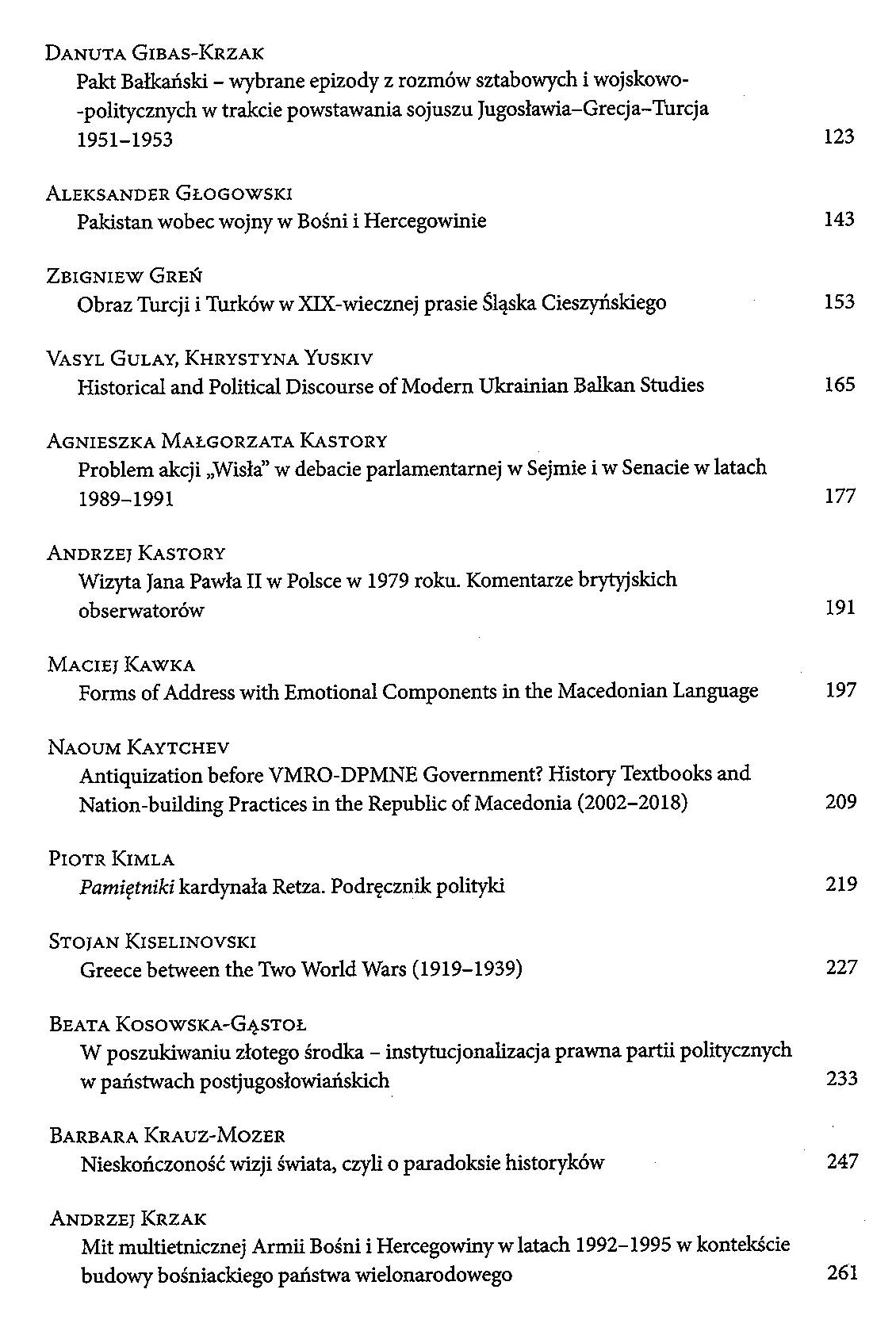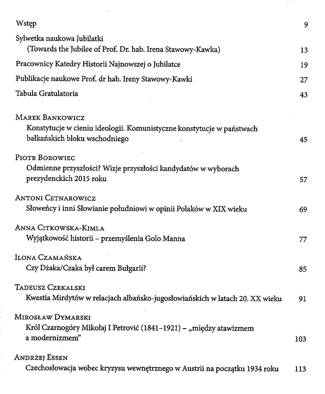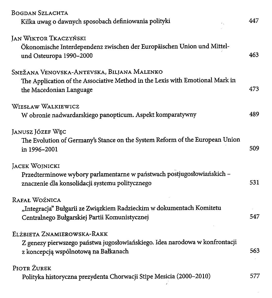 W publikacji Europa Środkowa i Bałkany zamieszczono opracowania historyczne, politologiczne i slawistyczne, dotyczące zarówno dawniejszych wieków, jak i okresu I i II wojny światowej. Wśród tekstów na temat dawniejszych czasów znajdziemy między innymi charakterystykę Czaki (Dżaki) ze Złotej Ordy oraz jego losów w państwie bułgarskim, analizę roli Cyryla i Metodego jako ponadwyznaniowych patronów narodów Europy czy omówienie obrazu Turków w prasie Śląska Cieszyńskiego XIX stulecia. Realia panujące na początku XX wieku przedstawili autorzy pracy na temat kryzysu w latach 1908–1909 (związanego z aneksją Bośni i Hercegowiny) i artykułu poświęconego trzem wilajetom – obszarom położonym na terytorium dzisiejszej Macedonii i Albanii, wokół których toczyła się dyskusja między ówczesnymi państwami regionu. W książce znajdują się także rozprawy analizujące sytuację polityczną w dwudziestoleciu międzywojennym oraz w okresie od zakończenia II wojny światowej aż do dzisiaj. W niniejszej publikacji zamieszczono również opracowania z zakresu myśli politycznej i konstytucjonalizmu oraz artykuły o charakterze językoznawczym.