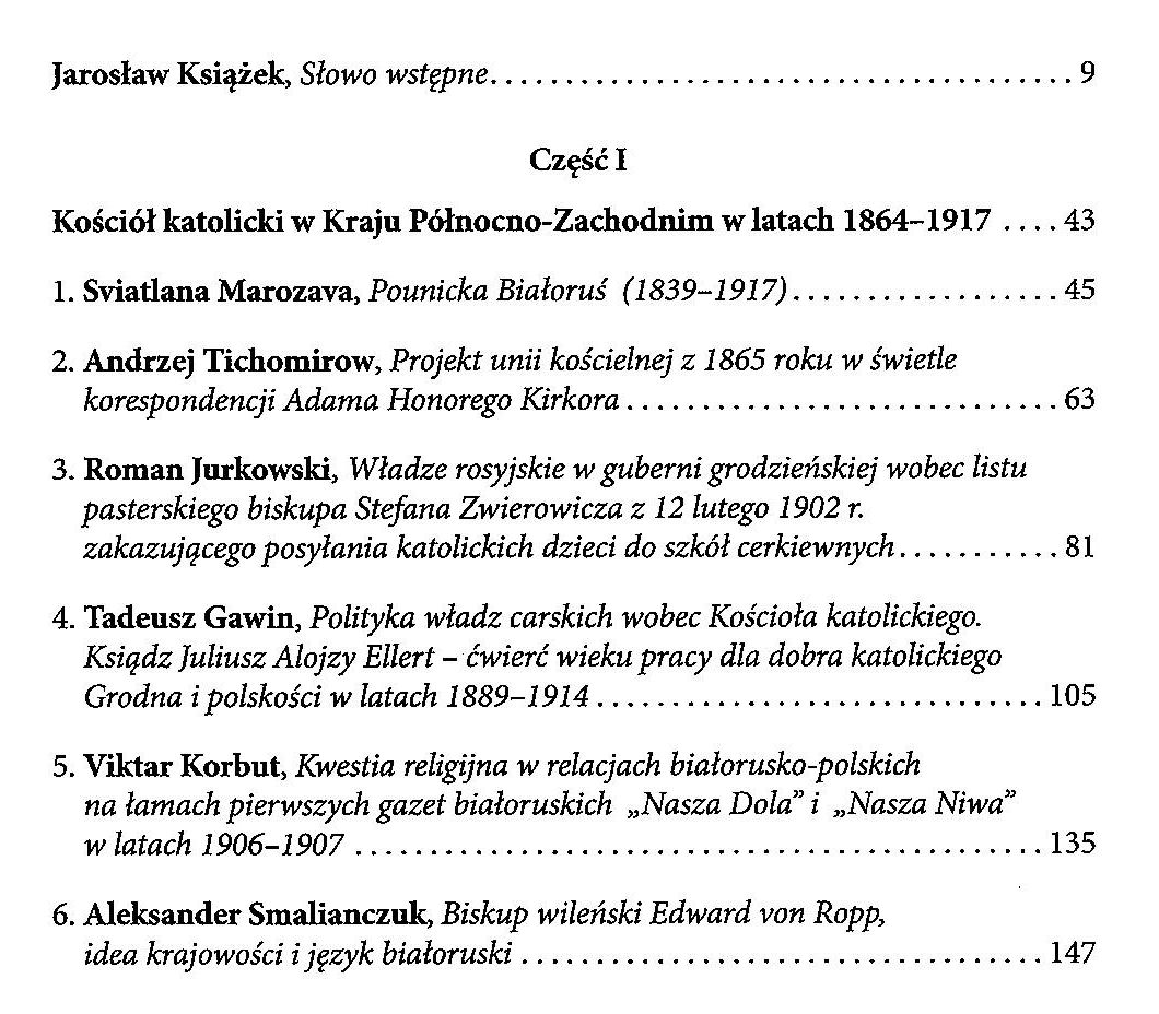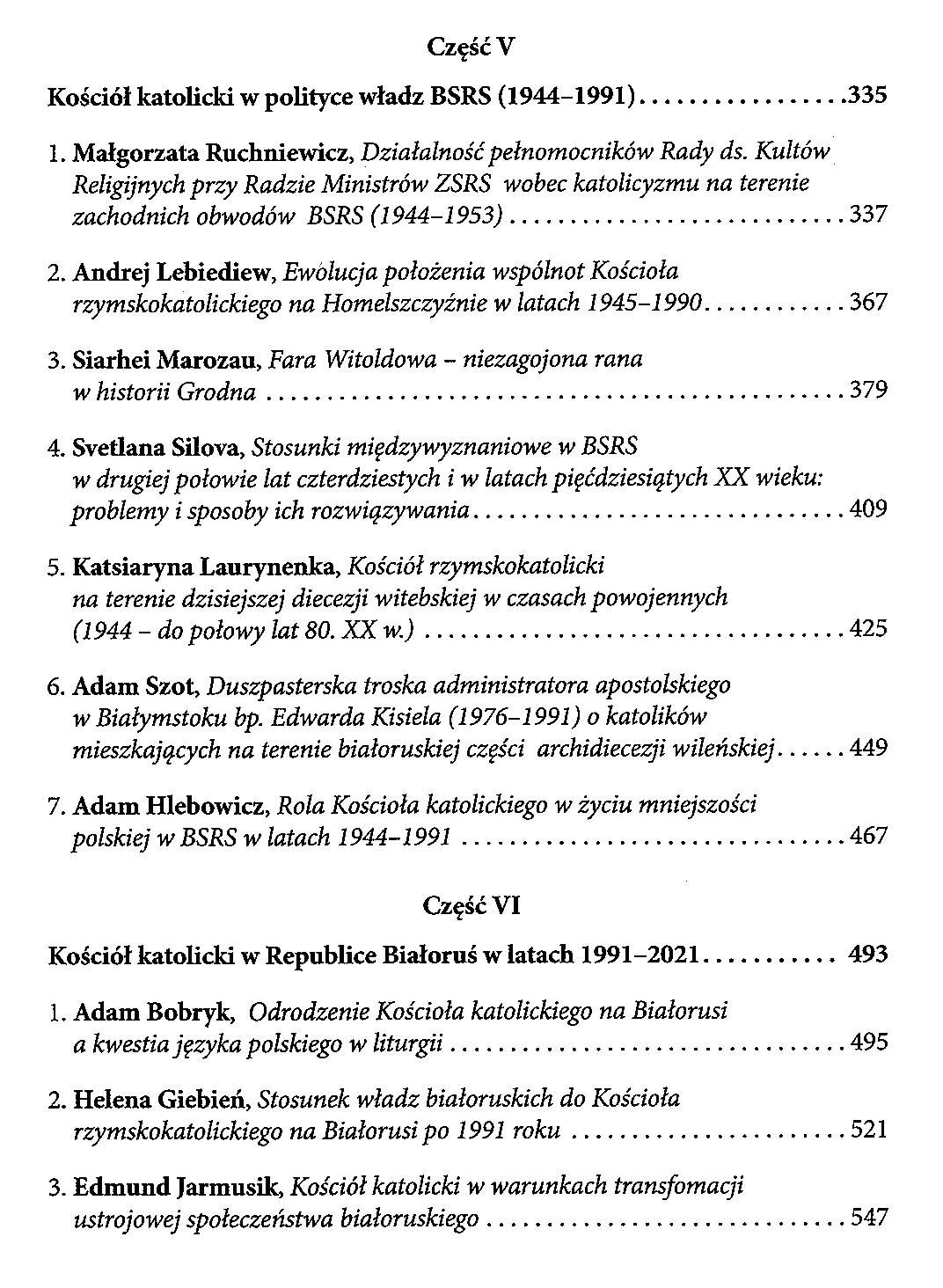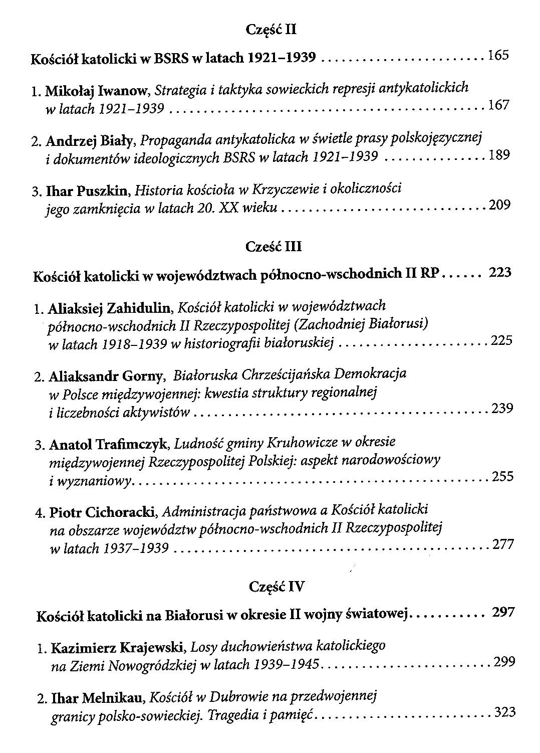 Prezentowane materiały odzwierciedlają działalność Kościoła katolickiego na terenie Białorusi w różnych epokach historycznych. Autorzy pokazali rolę Kościoła w życiu publicznym i jego relacji ze strukturami państwowymi. Bardzo ciekawe są materiały poświęcone działalności różnych przedstawicieli Kościoła katolickiego. Artykuły charakteryzują się wysokim stopniem nowości naukowej. Ich autorzy przeanalizowali szeroki wachlarz źródeł historycznych, w tym odkryli wiele nowych materiałów archiwalnych. Umożliwiło to wyciągnięcie oryginalnych i uzasadnionych wniosków. Wydanie książki wnosi znaczący wkład w badanie historii Kościoła katolickiego na terenie Białorusi oraz stosunków polsko-białoruskich. Prof. dr hab. Nikolaj Mezga; historyk, Homelski Uniwersytet Państwowy im. F. Skoryny w Homlu