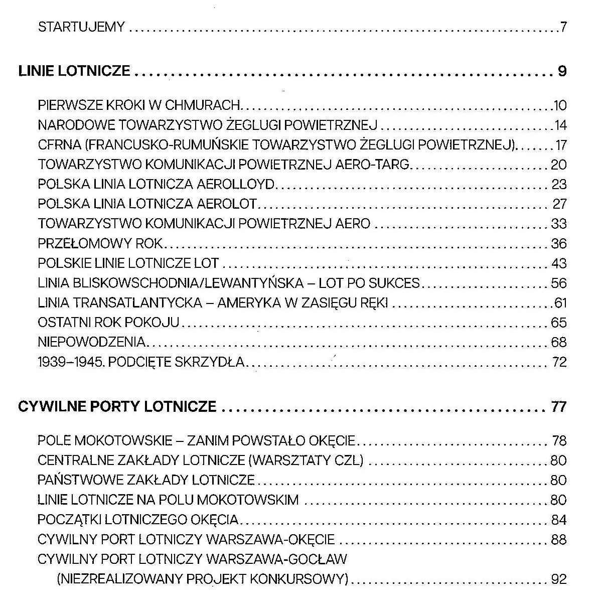 W grudniu 1903 roku bracia Orville i Wilbur Wright w Kitty Hawk, w Karolinie Północnej w USA, dokonali pionierskiego przelotu skonstruowanym własnoręcznie płatowcem, napędzanym silnikiem spalinowym. Zaledwie dziesięć lat później, w czerwcu 1913 roku, na warszawskim Polu Mokotowskim wylądował samolot, który dostarczył kilkanaście egzemplarzy porannego wydania paryskiego dziennika „Le Matin”. Był to pierwszy odnotowany lot komercyjny na ziemiach polskich. W odrodzonej Rzeczypospolitej, pomimo wielu problemów technicznych, organizacyjnych i finansowych, już w 1921 roku w Poznaniu powstał Aero-Targ, który uznaje się za pierwszą polską linię lotniczą. W kolejnych latach prywatne firmy podejmowały, z różnym skutkiem, próby organizowania regularnej komunikacji pasażerskiej i towarowej. Przełom nastąpił na początku 1929 roku. W lutym rozpoczęły działalność państwowo-samorządowe Polskie Linie Lotnicze LOT, jeden z pierwszych przewoźników w Europie. Przed wybuchem II wojny światowej nowoczesnymi lockheedami, z wizerunkiem stylizowanego żurawia na ogonie, można było podróżować od Helsinek przez Warszawę aż po Bejrut. Połączenie z Ameryką Północną i Południową także było już w zasięgu ręki. Choć historia lotnictwa liczy sobie tylko 120 lat, warto przypomnieć, jak wielki skok cywilizacyjny dokonał się w tym czasie. Mieli w nim swój udział także polscy wizjonerzy, zajmujący wysokie stanowiska we władzach wojskowych oraz administracji państwowej, przedsiębiorcy, inżynierowie, a także piloci, którzy konsekwentnie i skutecznie, na miarę ówczesnych możliwości, realizowali marzenia o podniebnych podróżach. To właśnie im i efektom ich pracy poświęcone zostało niniejsze wydawnictwo. Aby jak najpełniej zaprezentować te dokonania, książka została podzielona na trzy uzupełniające się rozdziały. W pierwszym poznajemy historię tworzenia polskiej komunikacji powietrznej i linii lotniczych, w drugim – powstanie i rozwój regionalnych portów lotniczych, w trzecim – inwestycje cywilne i wojskowe zrealizowane wokół lotniska na warszawskim Okęciu. Publikację wzbogaca ponad 360 ilustracji, z których część jest mało znana lub nigdy nie była publikowana. Całość tworzy kompendium wiedzy o cywilnym transporcie lotniczym na ziemiach polskich w czasach II Rzeczypospolitej.
