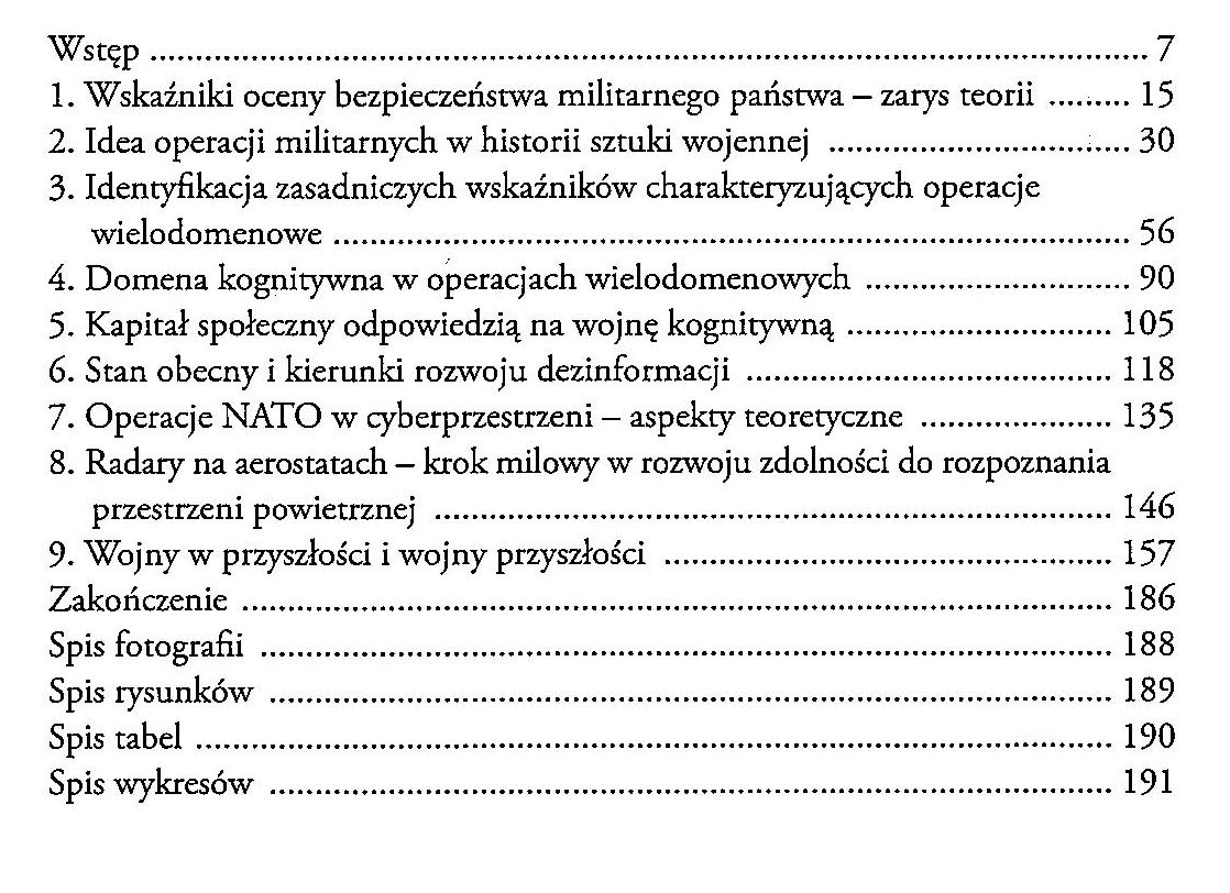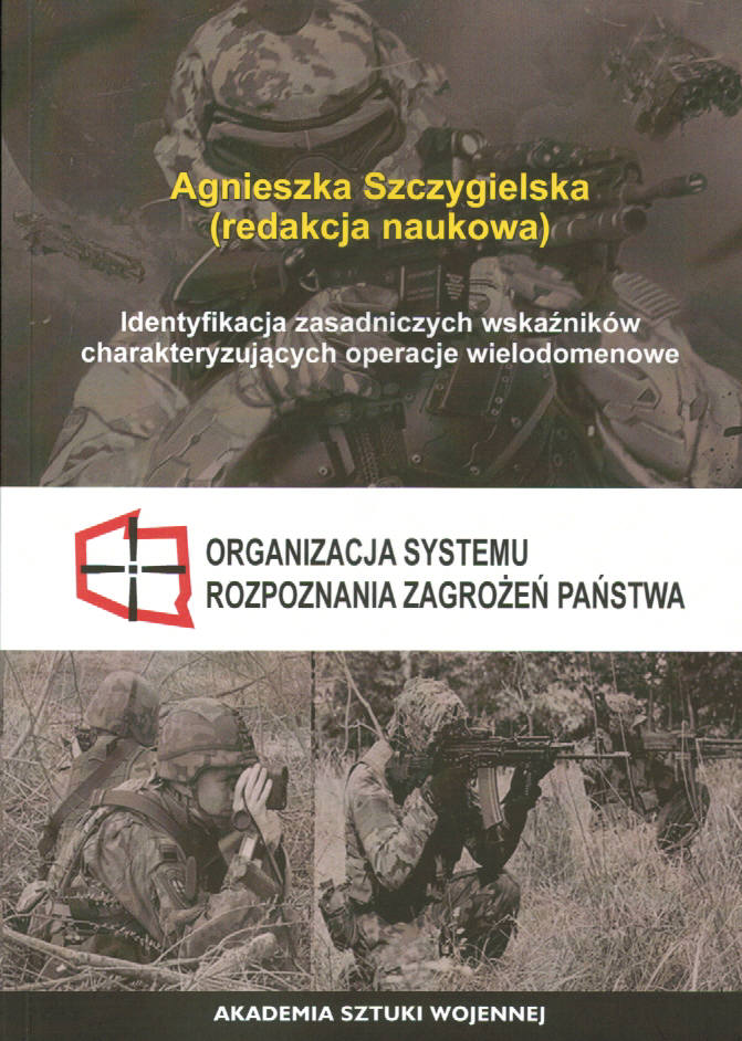Opracowanie monografii „Organizacja systemu rozpoznania zagrożeń państwa – identyfikacja zasadniczych wskaźników charakteryzujących operacje wielodomenowe” powstało z zamiarem ukazania różnych spojrzeń, patrzenia z różnych punktów widzenia, czasami szerszych tematycznie i z dystansu, innym razem przez soczewkę, wycinkowo a kolejnym razem konstruując obraz przyszłości, patrząc perspektywicznie daleko w przód – co kompleksowo ujęte, ukazuje złożoność opisywanego zagadnienia i tym samym podkreśla konieczność nieustannego jego przepracowywania. Celem opracowania jest zatem ukazanie zarówno tła jak i uwarunkowań operacji wielodomenowych oraz szerokoaspektowego postrzegania kwestii bezpieczeństwa militarnego. Te zagadnienia zaś osadzone są w kontekście systemu rozpoznania zagrożeń państwa. Strukturę pracy stanowi dziewięć rozdziałów tematycznych. Każdy rozdział tematyczny jest rozwiązaniem określonego problemu naukowego. Zawarte w monografii rozważania, wnioski i opinie prezentują indywidualne poglądy autorów dotyczące kwestii wyrażonych w poszczególnych rozdziałach. Prezentowane treści stanowią odzwierciedlenie wiedzy i umiejętności metodologicznych autorów.