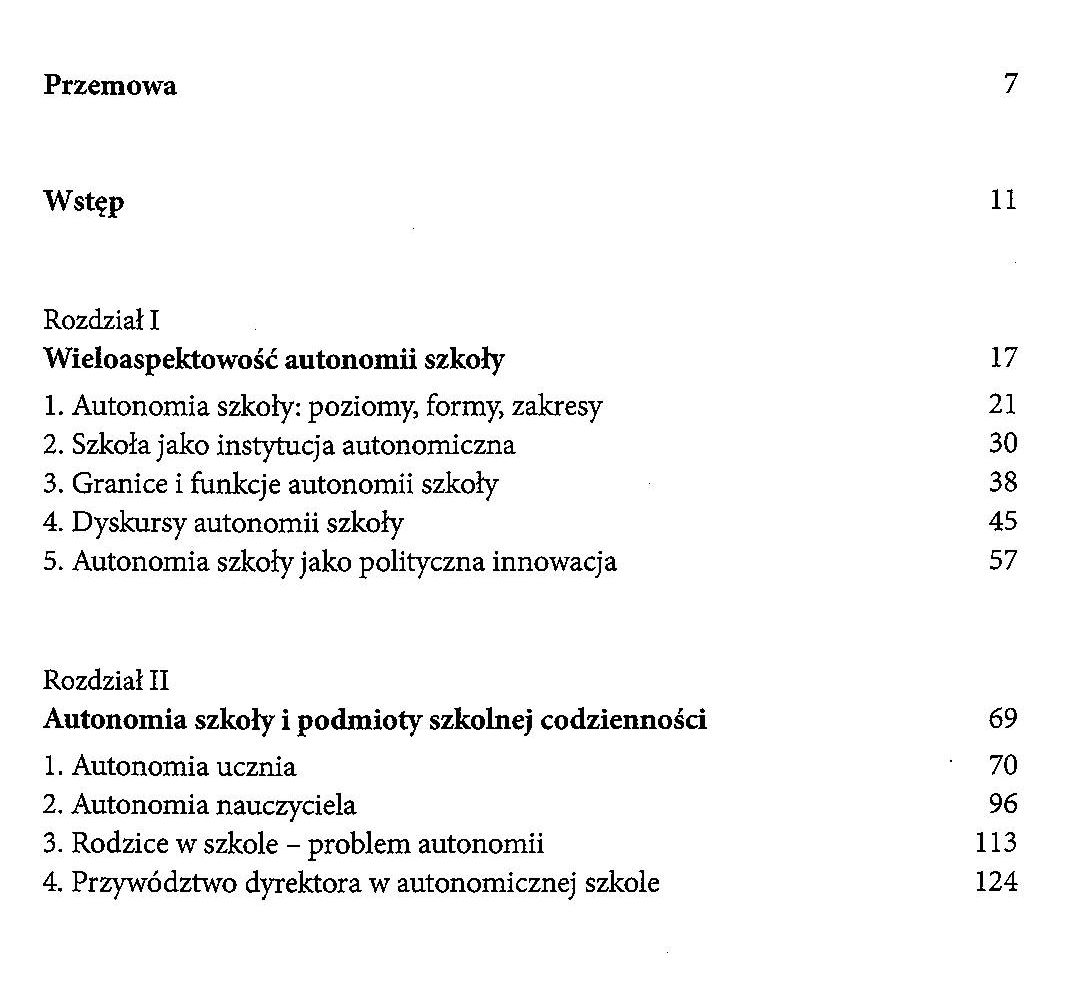 Seria książek Studia z pedagogiki szkoły pod patronatem Komitetu Nauk Pedagogicznych Polskiej Akademii Nauk obejmuje tematy związane z teorią i praktyką nauczania, organizacją pracy szkoły, rozwojem uczniów, metodami dydaktycznymi, psychologią szkolną oraz innymi aspektami funkcjonowania placówek edukacyjnych. Przyjęta w tytule tomu kategoria autonomii szkoły zwraca uwagę na warunki realizacji przez szkoły wszelkich koncepcji pedagogicznych, kształtowania przyjętej misji, przebiegu procesów, które mają sprzyjać efektywności edukacji zorientowanej na holistyczny rozwój uczniów i relacji głównych podmiotów szkolnego życia. Stąd rozpoznanie kategorii autonomii szkoły oraz kontekstów, w które jest uwikłana stanowi punkt wyjścia pod zjawiska i procesy ukrywające się za murami szkół. Celem Autorów jest wykazanie znaczenia autonomii szkoły w szkolnej codzienności oraz roli podmiotów edukacyjnych w jej kształtowaniu i rozwoju. Na podstawie istniejących koncepcji teoretycznych i rezultatów badań została podjęta również dyskusja nad praktycznymi możliwościami realizacji koncepcji autonomicznej szkoły, jako niezbędnego warunku wzmocnienia rozwoju szkół.