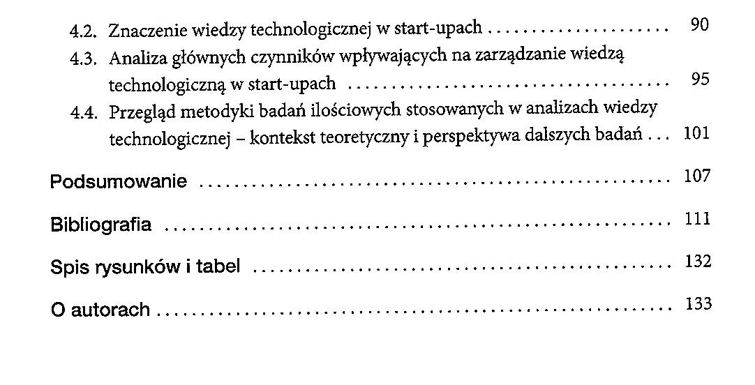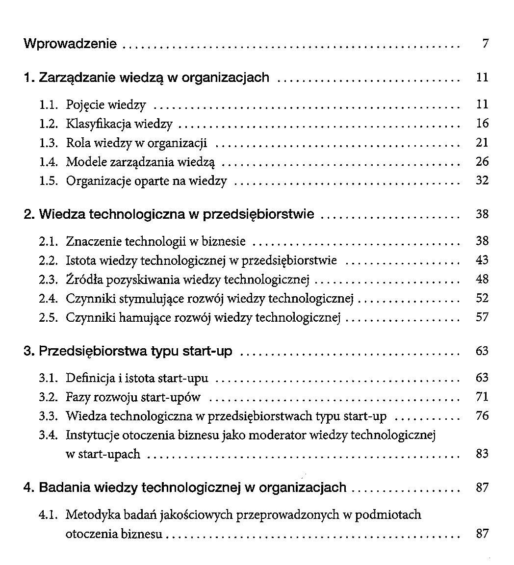 Książka stanowi studium poświęcone zarządzaniu wiedzą technologiczną, identyfikując ją jako kluczowy czynnik rozwoju innowacyjnych organizacji, jakimi są start-upy. W obliczu dynamicznych, globalnych wyzwań firmy dążą do wzmacniania swojej pozycji konkurencyjnej, wykorzystując wiedzę jako unikatowy zasób strategiczny. Mimo że zarządzanie wiedzą jest często uważane za domenę dużych przedsiębiorstw, start-upy (jako mikro i małe firmy) także efektywnie projektują procesy zarządzania technologią, osiągając sukcesy rynkowe. Głównym motywem podjętych w publikacji rozważań jest zrozumienie roli wiedzy technologicznej w działalności start-upów. W związku z tym główny cel pracy koncentruje się na identyfikacji roli i determinant zarządzania wiedzą technologiczną w start-upach, uwzględniając procesy jej tworzenia, pozyskiwania, transferu i zastosowania. Metodologia badawcza opiera się na pogłębionych studiach literatury naukowej i branżowej, uzupełnionych o badania jakościowe przeprowadzone wśród ekspertów z sektora wspierającego rozwój start-upów. Zebrany materiał badawczy umożliwił pogłębioną analizę jakościową problemu badawczego oraz wniesienie nowej perspektywy do studiów nad zarządzaniem wiedzą w start-upach. Obszar ten jest wciąż w niewystarczającym stopniu zbadany, a publikacja wypełnia tę lukę, otwierając jednocześnie wiele nowych kierunków eksploracji.